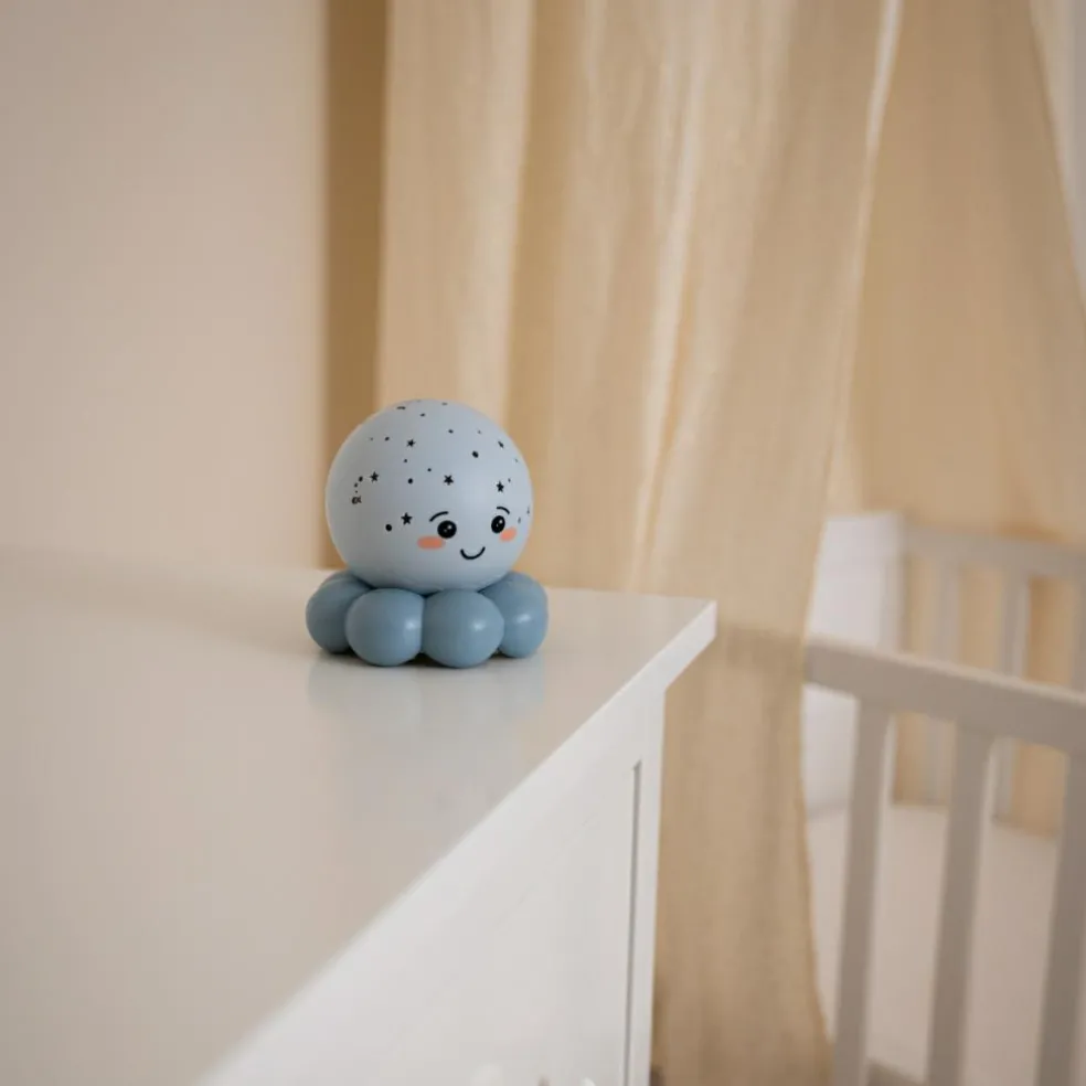 La veilleuse Twinkles To Go Octo bleu pastel est le compagnon idéal en voyage pour accompagner bébé vers un sommeil paisible. Cette petite veilleuse pieuvre projette des motifs amusants d’étoiles, de poissons et de bulles en 3 couleurs.