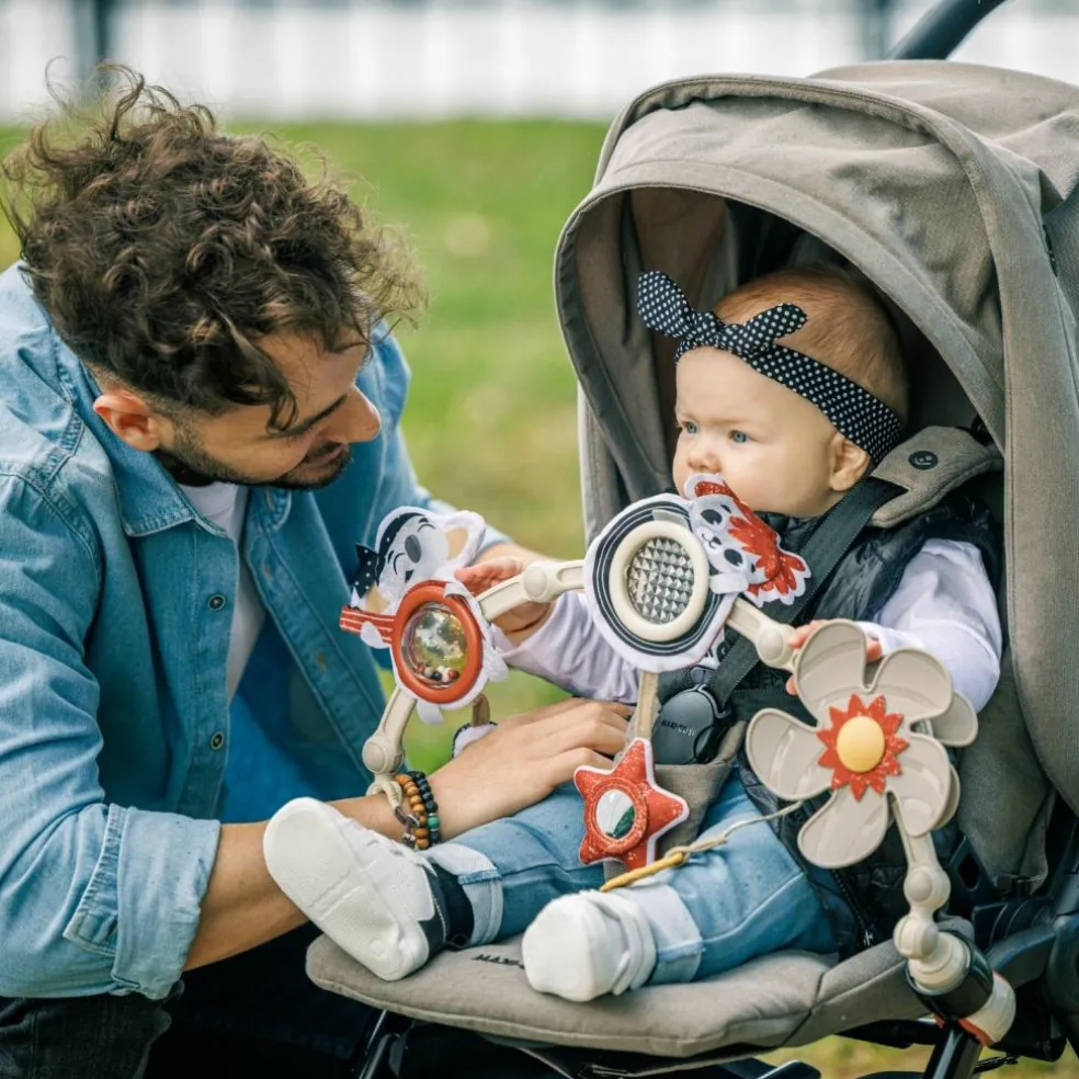 – 6 jouets : Balle bruissante, miroir facile d’accès, prisme soleil transparent, hélice activée par bébé, hochet, anneau de dentition.