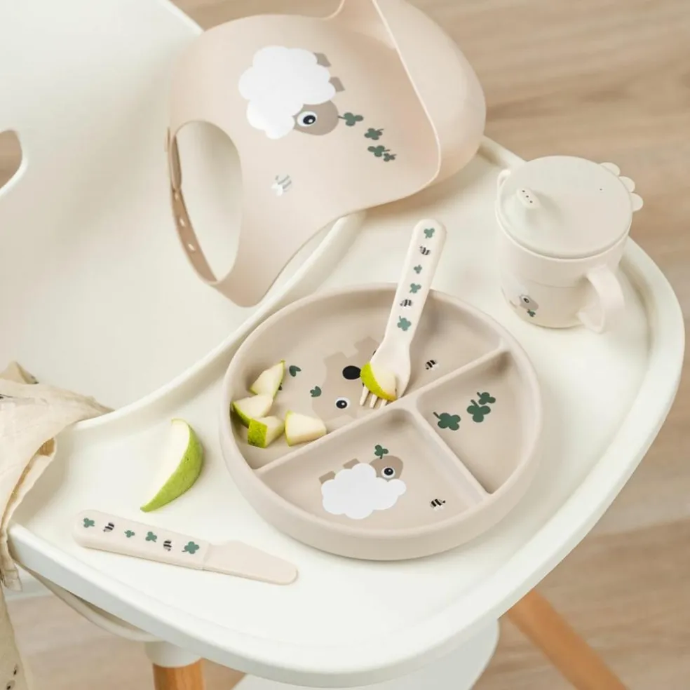 – Assiette de couleur sable aux formes et motif rigolos de Sheepy et Dotti.