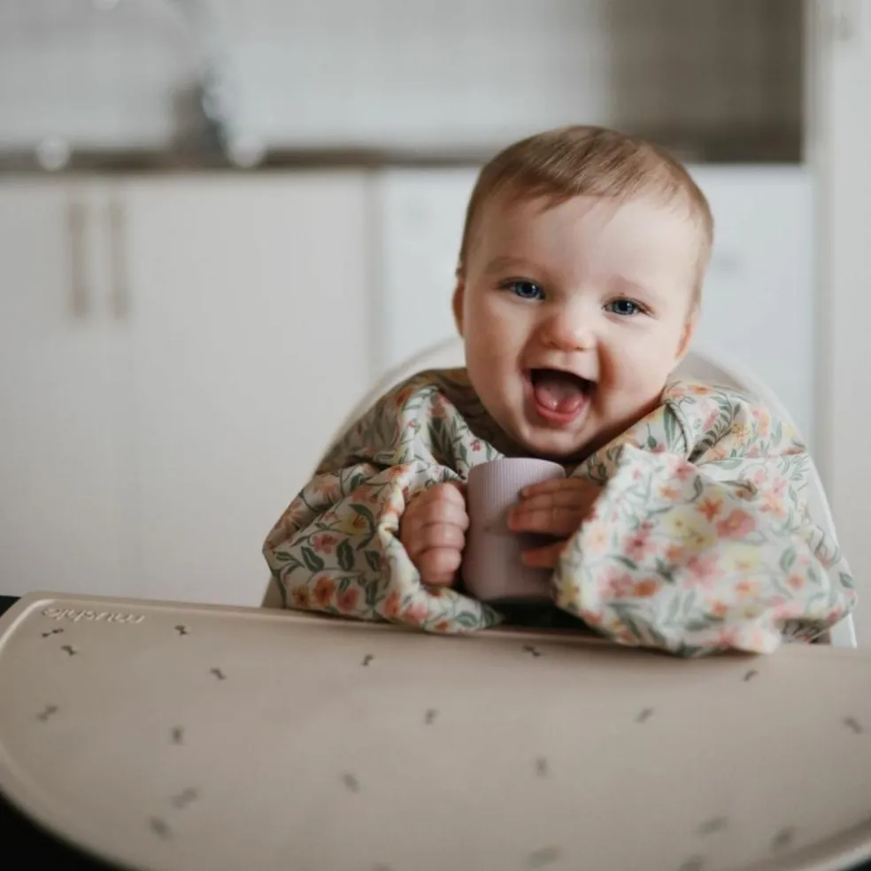 Un indispensable pour les petits gourmands et artistes en herbe : Avec le Bavoir à manches longues Pastel Blooms de Mushie, fini les tâches et place aux découvertes en toute liberté !