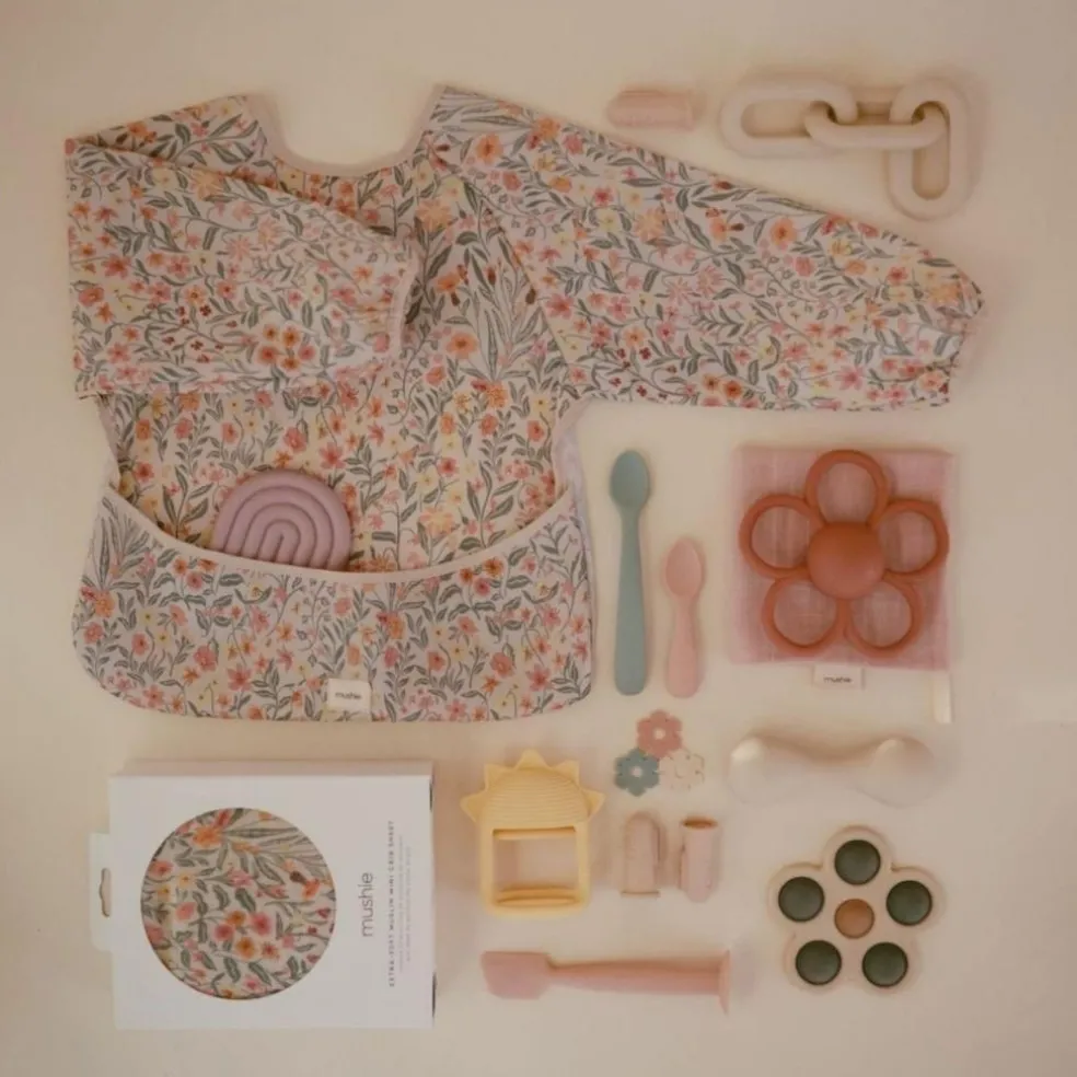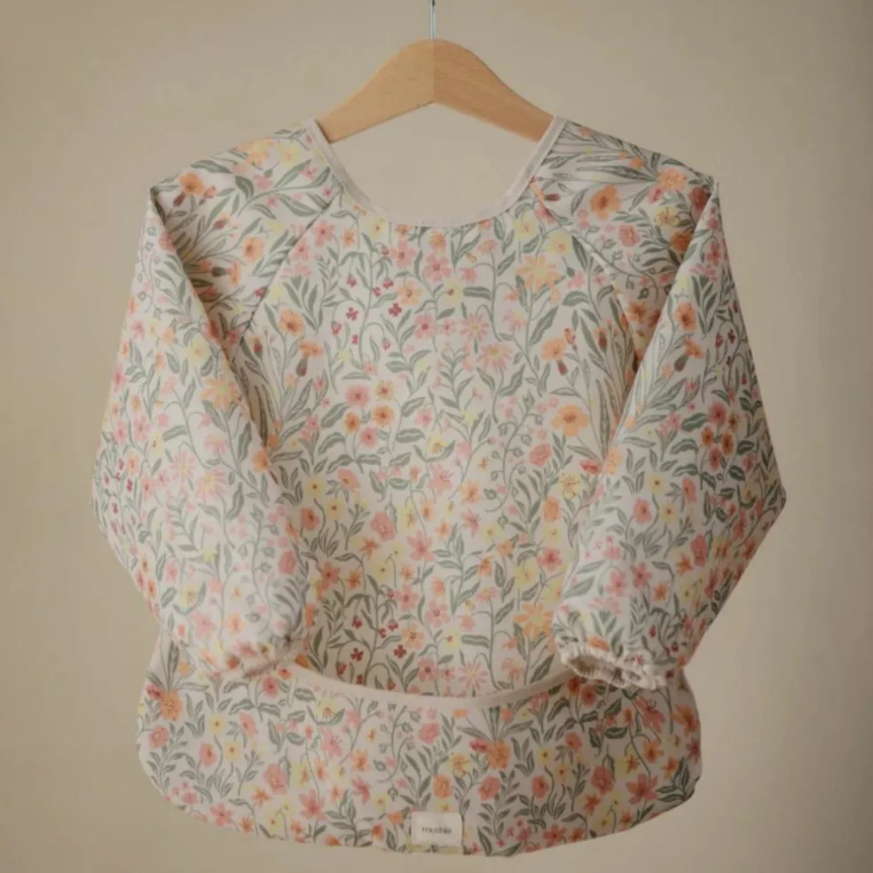 Protégez les vêtements de bébé de toutes les tâches grâce au bavoir à manches longues Pastel Blooms de Mushie !