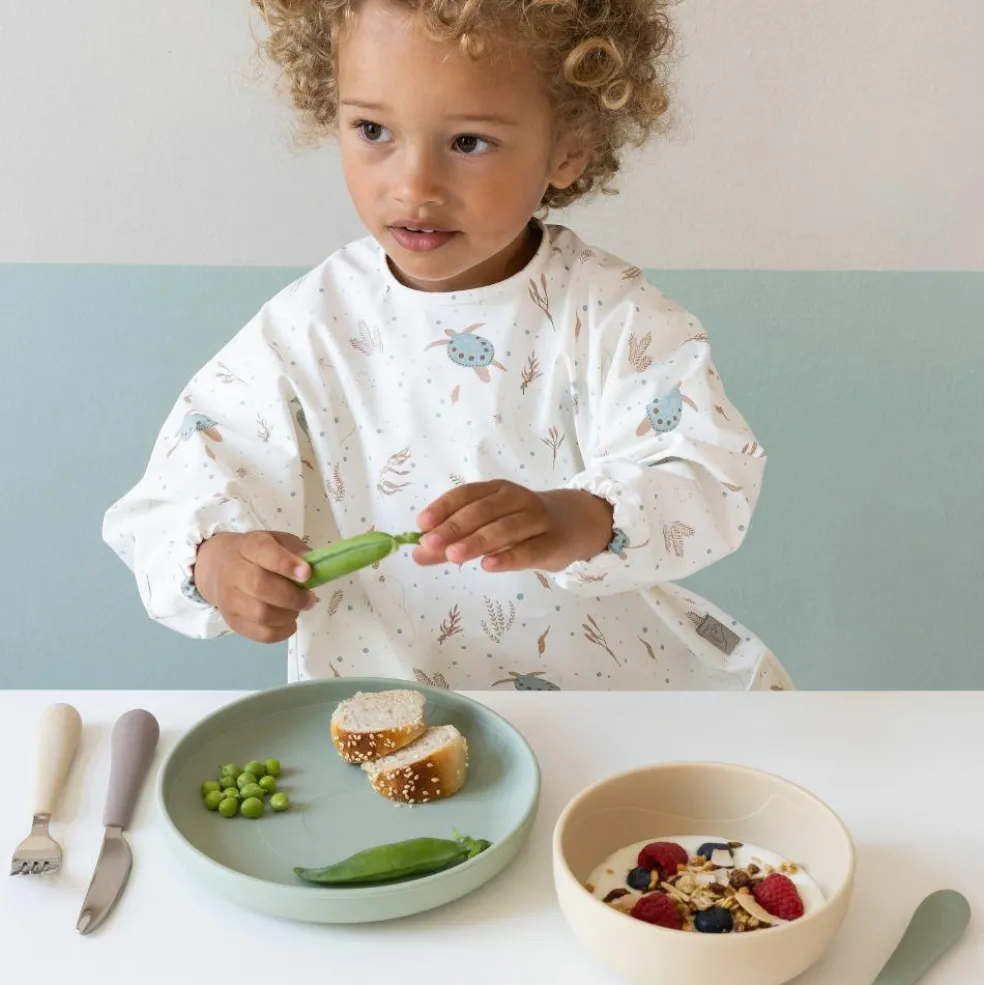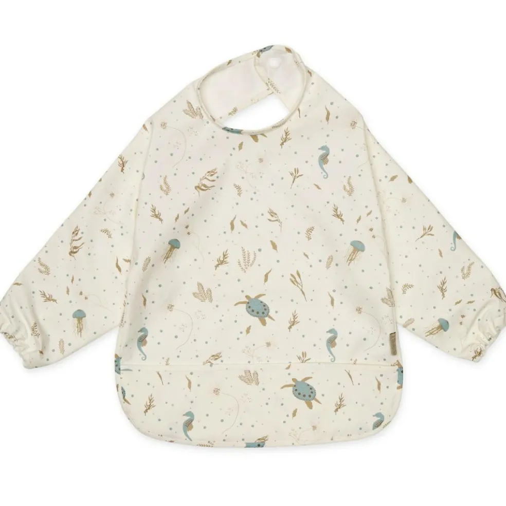 – Bavoir intégral à manches longues doté d’une poche pratique.