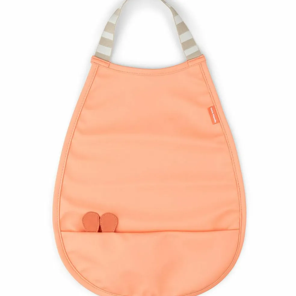 L’adorable bavoir corail a un élastique à rayures. Au-dessus de la pochette, on aperçoit les oreilles de Raffi.