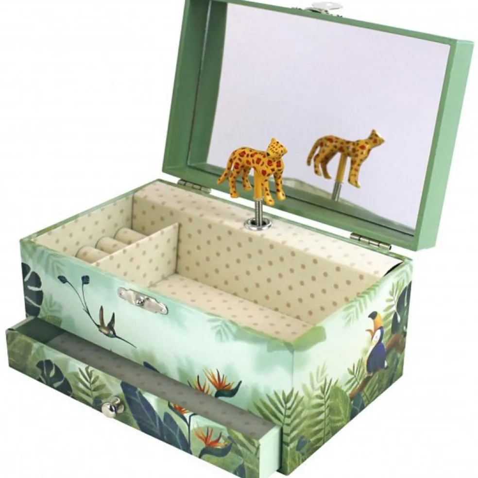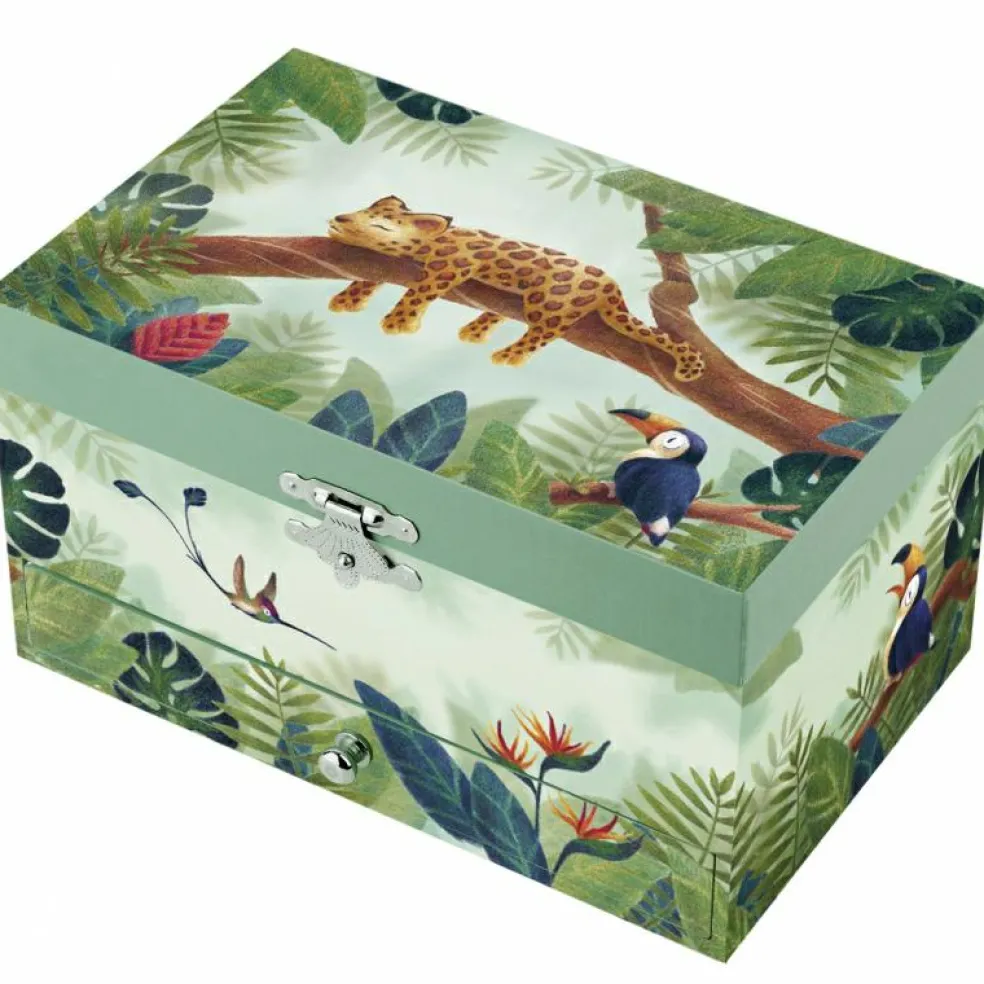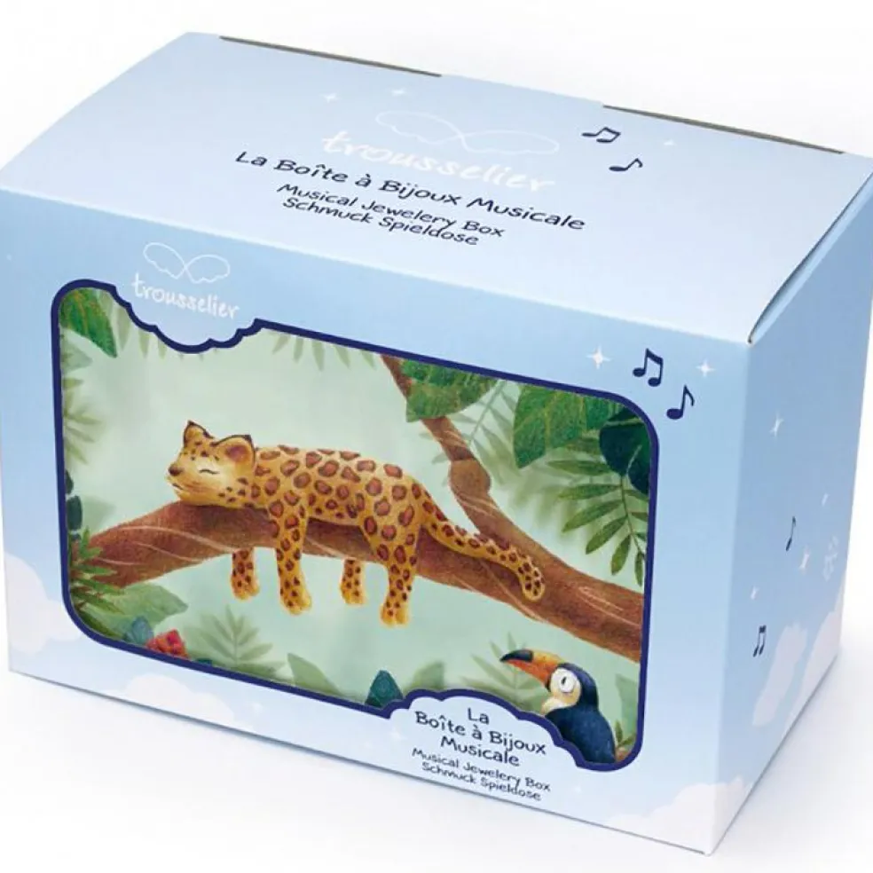 La boîte à bijoux musicale Savane de la marque Trousselier permet aux petits de ranger leurs plus précieux trésors. Une douce musique accompagne l’ouverture de la boîte pour un moment de poésie.