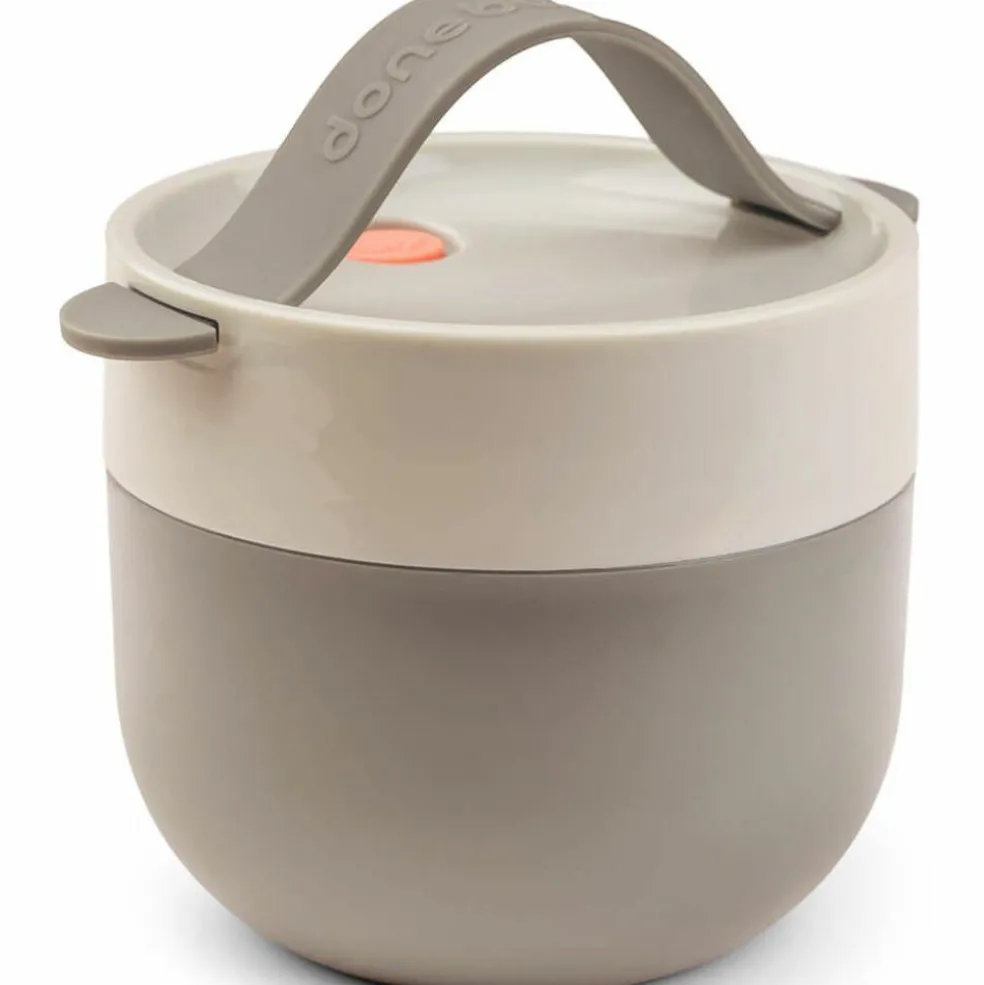 Le bol a un design sobre dans des couleurs modernes. Le couvercle à vis permet de bien le fermer. Les petites mains arrivent elles aussi à bien saisir la poignée en silicone amovible.