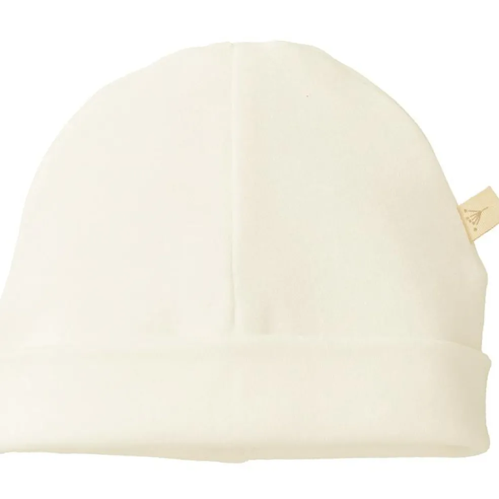 Le bonnet de naissance crème de la marque Fresk permet de tenir bien au chaud la tête de bébé.