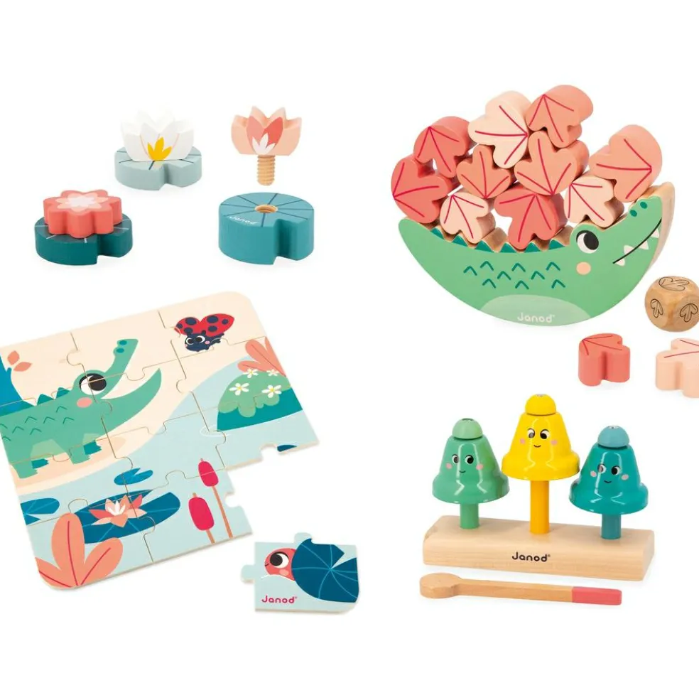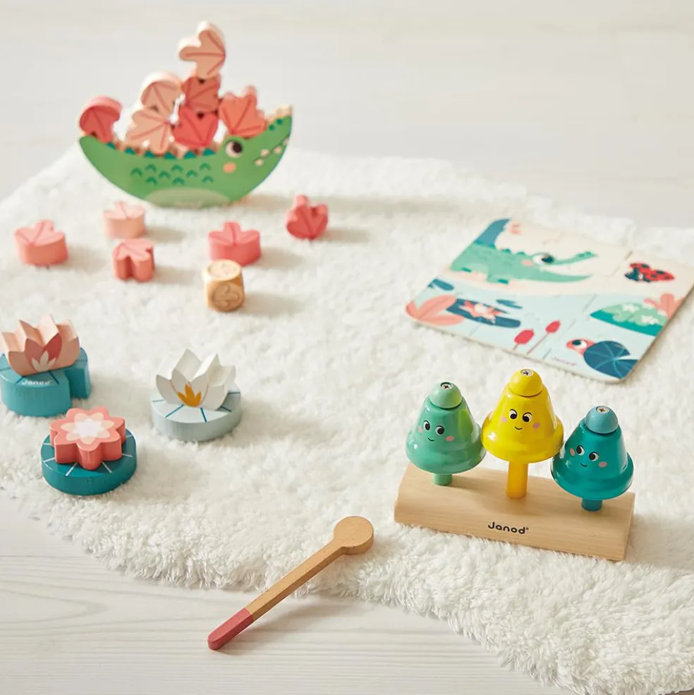 – 1 crocodile d’équilibre, 3 nénuphars à visser, 3 clochettes, 1 puzzle de 12 pièces.