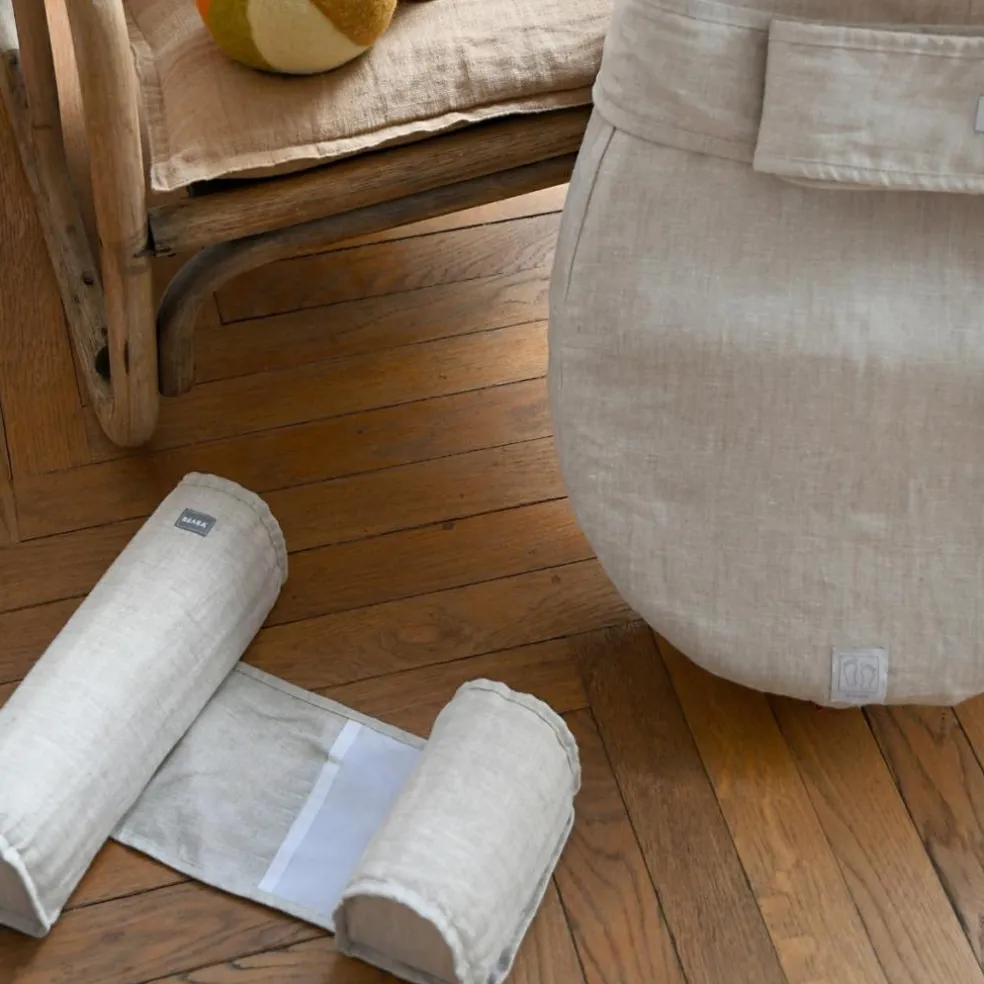 – 2 coussins-cale reliés par une bande de tissu sur laquelle on couche bébé.