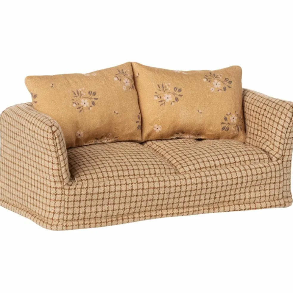 Conçu pour s’intégrer parfaitement dans l’univers miniature des souris Maileg, ce joli canapé au tissu à carreaux beige et aux coussins fleuris crée une atmosphère chaleureuse et vintage. Idéal pour faire vivre mille et une histoires à vos enfants, il transforme chaque moment de jeu en une scène douce et poétique.