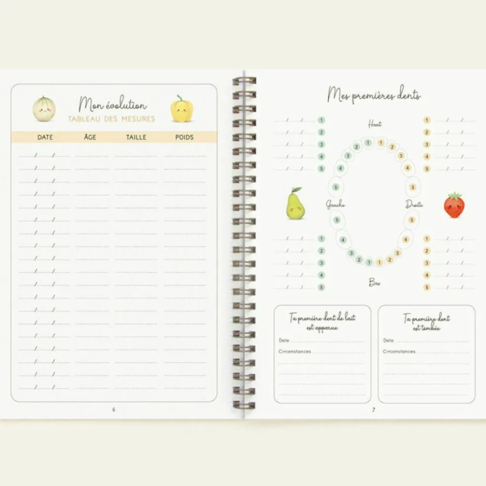 - Une double page pour suivre son évolution : tableau des mesures, premières dents…