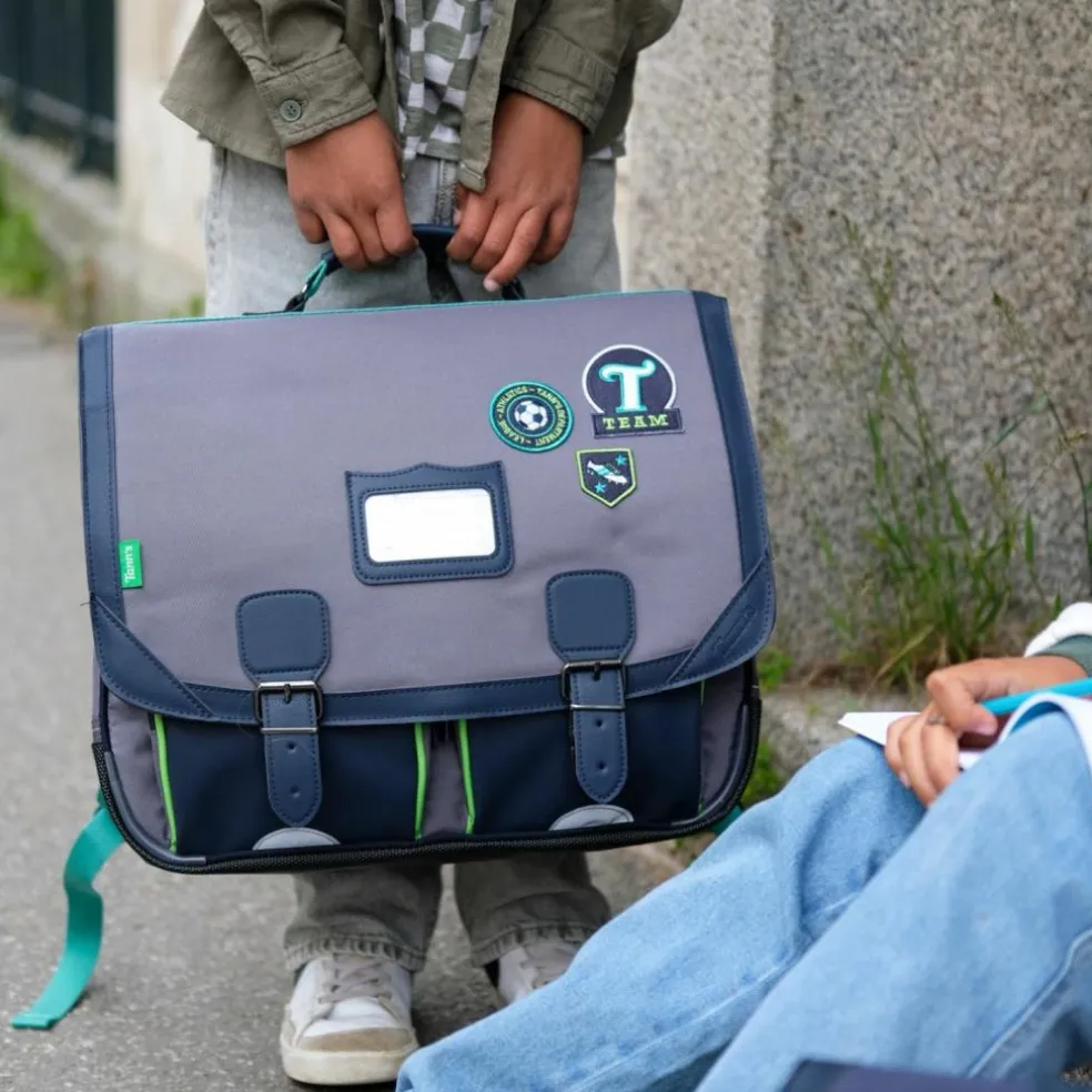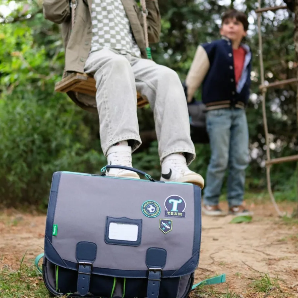 Avec ses patchs ballon et crampons, le modèle Tiago a été créé pour les footballeurs en herbe ! Sobre et classique avec son duo de couleurs gris et marine, ses accents aux nuances de vert lui apportent un dynamisme élégant ! Ce cartable est doté d’une ganse et d’une poche en matière grainée qui n’est pas sans rappeler les ballons de foot.