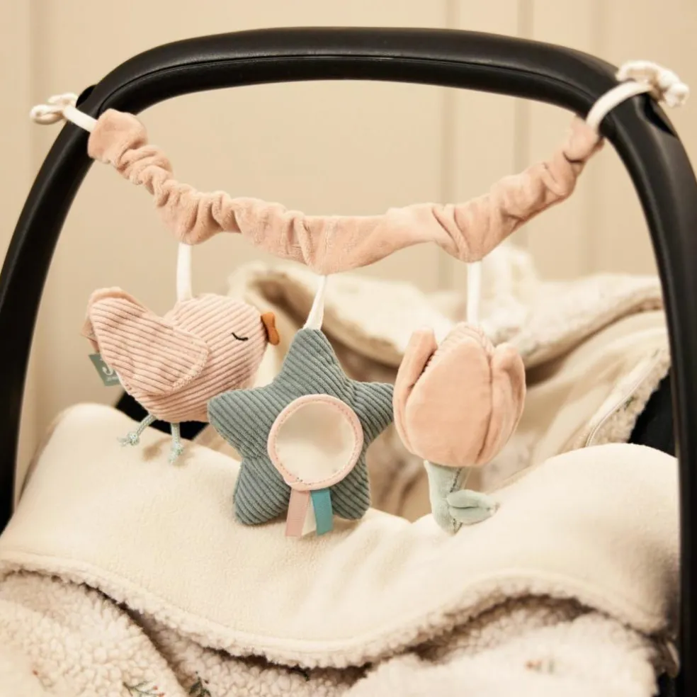 – Peut être fixé sur le cosy, la poussette, le parc, les barreaux du lit, etc.