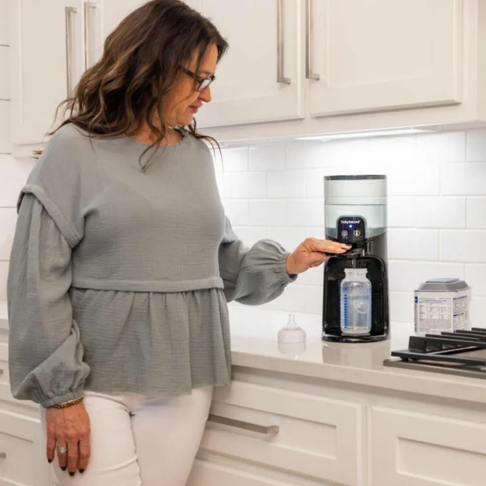 – Ajoutez le lait en poudre, mélangez et le biberon est prêt ! Laisser brancher et allumer la machine pour qu’elle chauffe en continue l’eau.