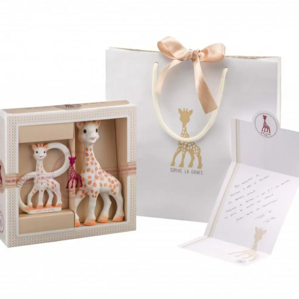 – Comprend 1 hochet Sophie la girafe, 1 anneau de dentition, 1 carte message à personnaliser et 1 sac cadeau.