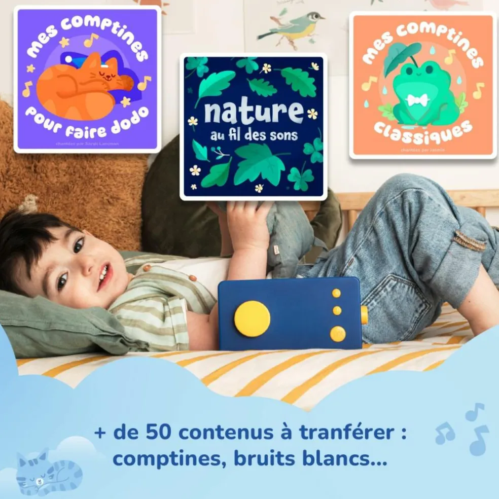 – Des contenus variés et apaisants : Comptines, berceuses, imagiers sonores et jusqu’à 30 min de bruits blancs pour faciliter l’endormissement naturellement.