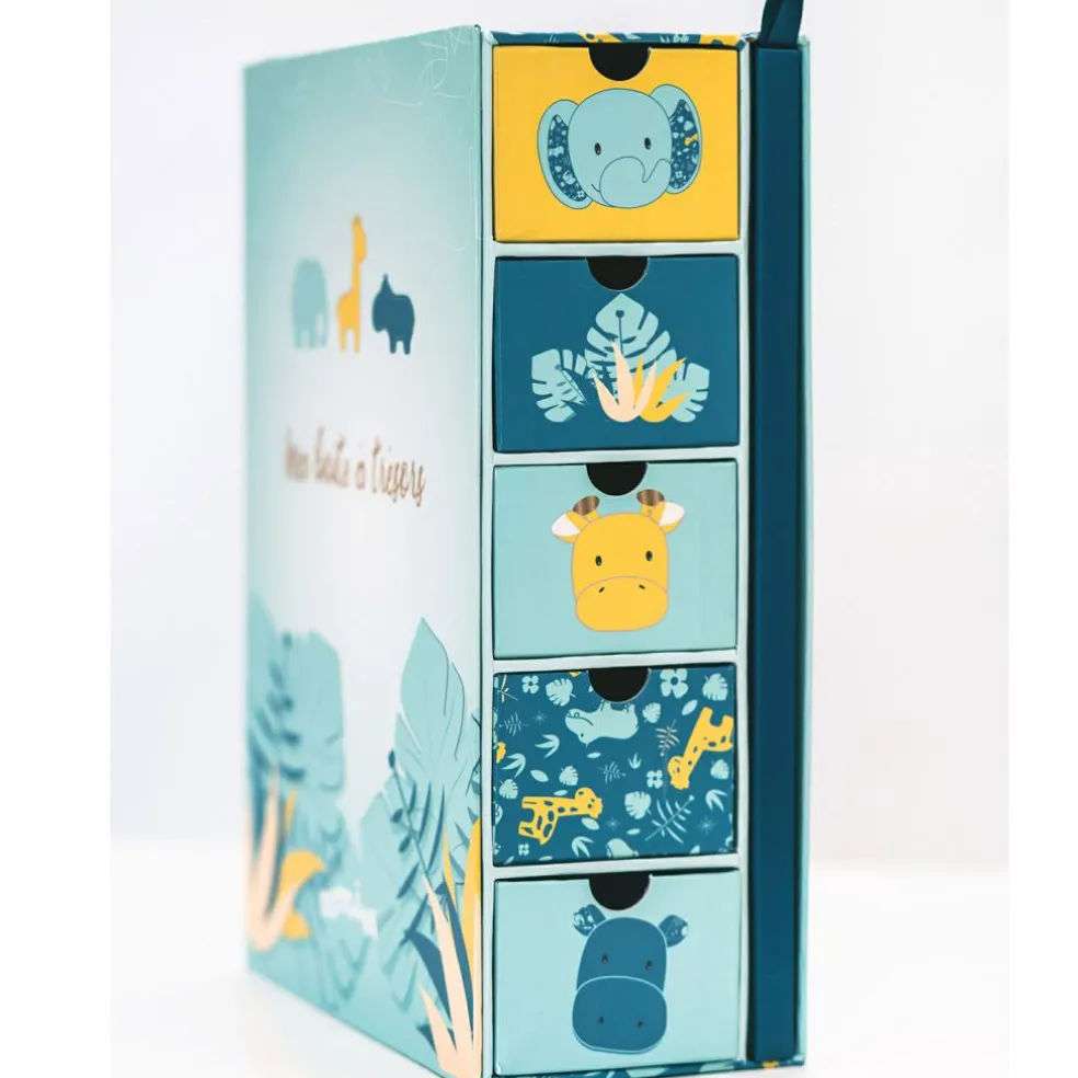 Le coffret ma boîte à trésors et son journal de naissance Zanimo de la marque Domiva gardera tous les trésors de bébé précieusement. Idéal comme cadeau de naissance, ce coffret vous permettra de conserver et de raconter son histoire à votre enfant grâce au journal de naissance et à l’arbre généalogique. Les 5 tiroirs et les sachets à souvenirs vous permettront de partager de jolis moments autour des petits trésors que vous y aviez glissé des années plus tôt.