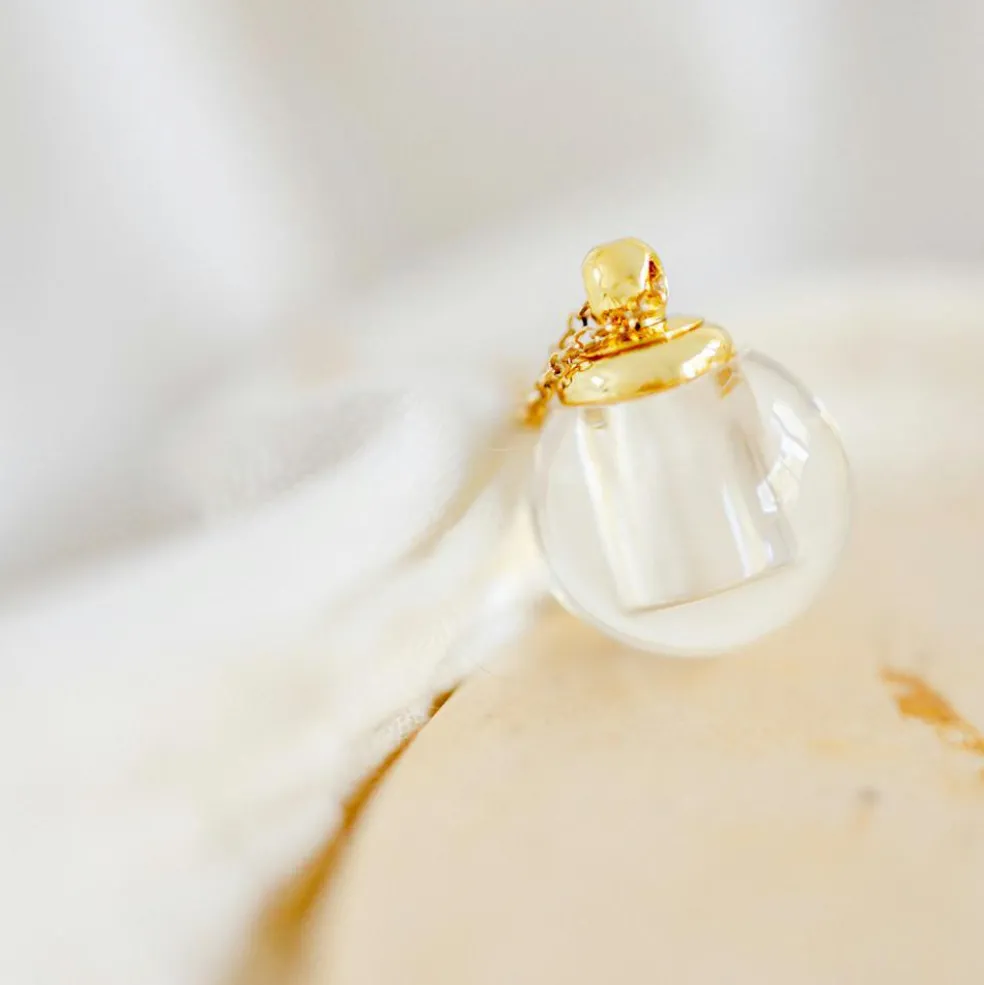 Ce petit bijou sacré s’inspire des précieuses “Dream box” bouddhistes. À l’intérieur de cette délicate fiole de verre, déposez l’un de vos souhaits les plus précieux noté sur une petite note de papier, refermez-la puis déposer celle-ci autour de votre cou, au plus près de votre cœur. Et puis… croyez fort en celui-ci afin qu’il se réalise…