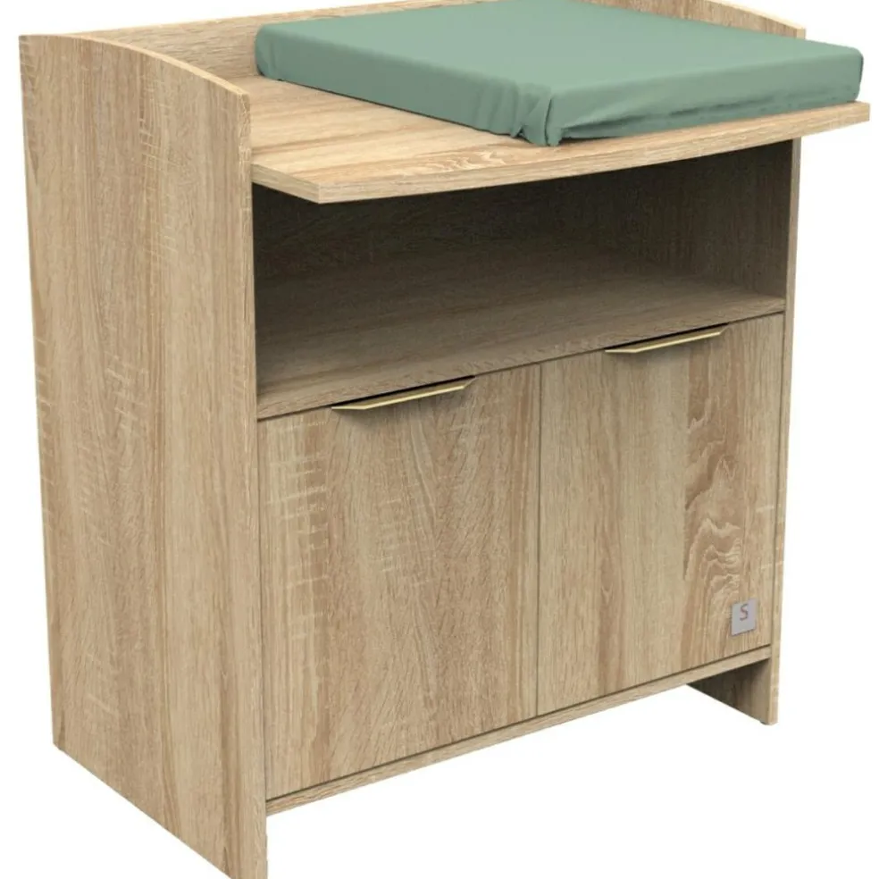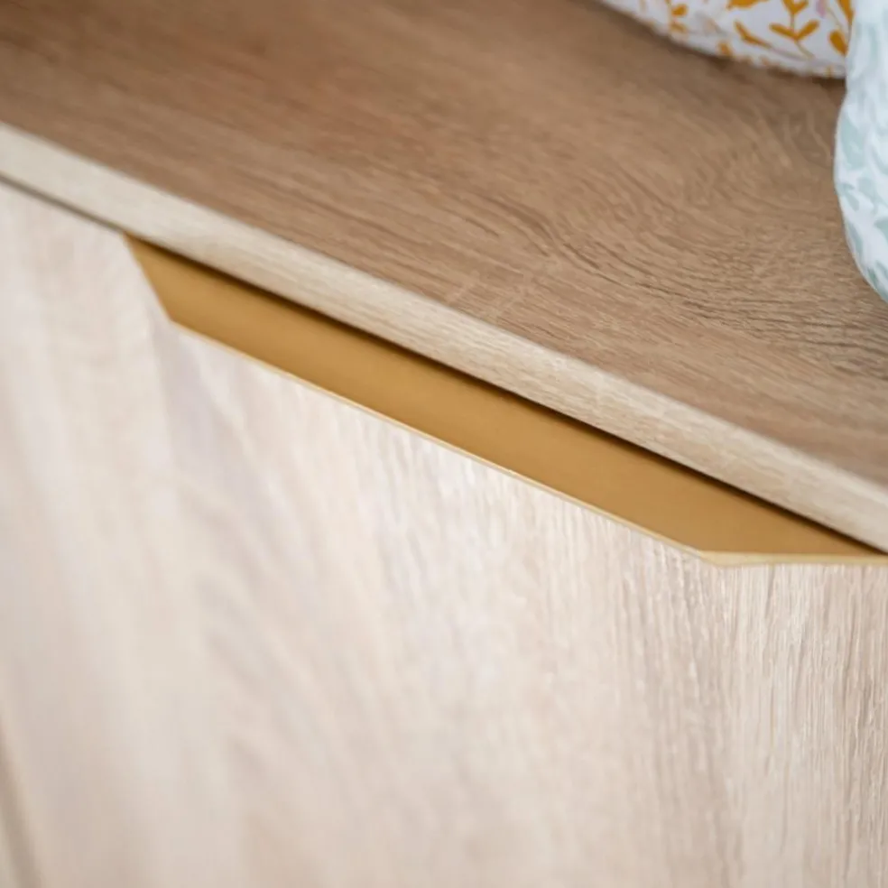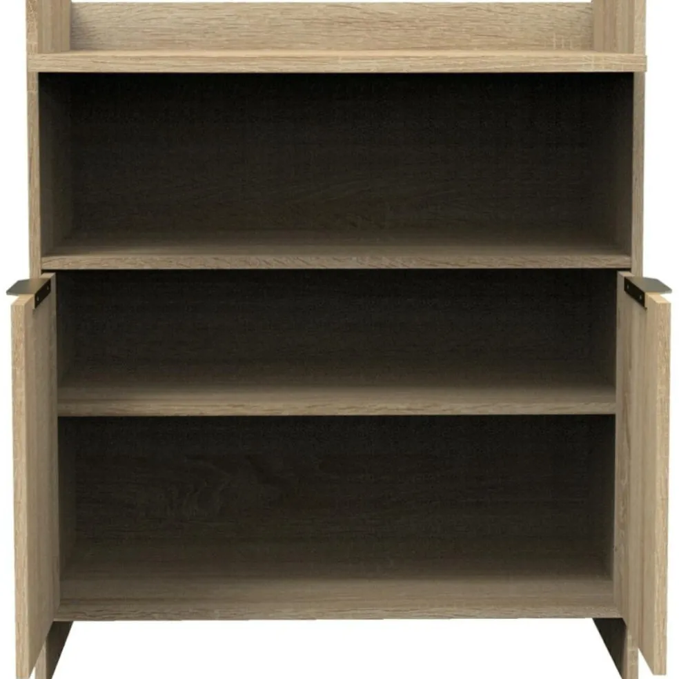 – Côtés, dessus, fronton, dessous, séparation horizontale, tablette intérieure et portes en panneaux de particules mélaminés décor chêne doré, chants décor bois.