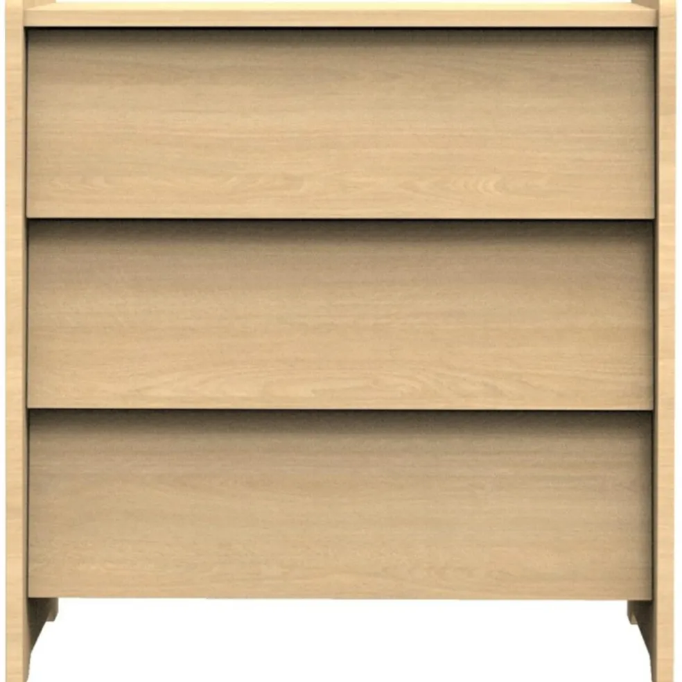 – Cotés, dessus et faces de tiroirs en panneaux de particules mélaminés décor chêne miel, chants décor bois.