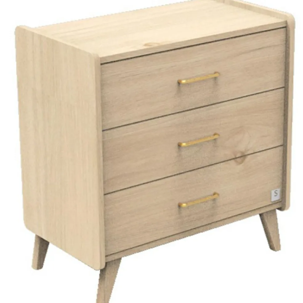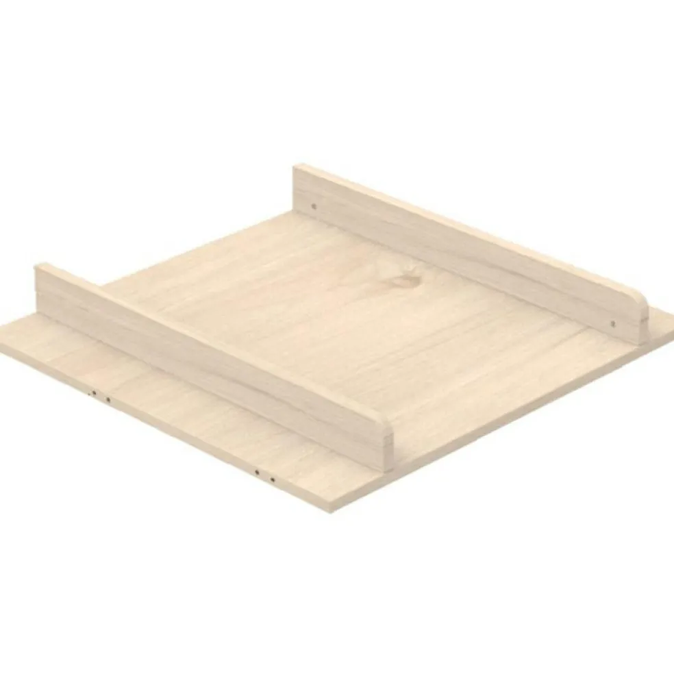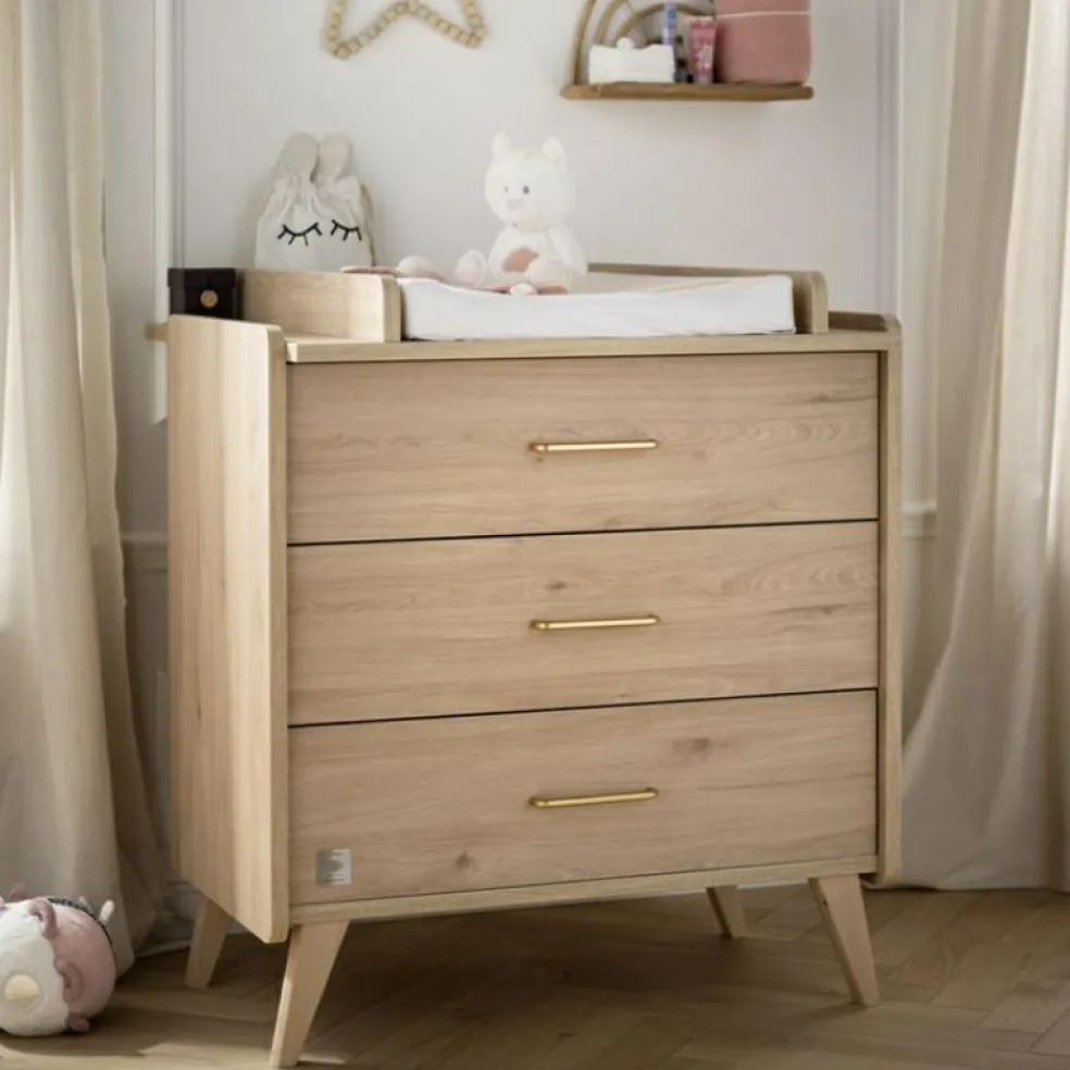 – Côtés faces tiroirs, dessus et dessous, dispositif à langer en panneaux de particules revêtus de papier décor chêne suave, chants décor bois.