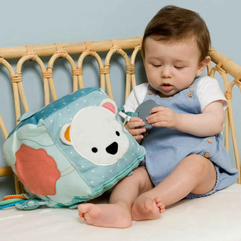 – Plusieurs activités : hochets, jeux de matières, tortue miroir pour y découvrir son reflet, matières ultra douces, détails brodés, 2 anneaux de dentition, petite tortue qui se cache dans le coquillage, tentacules de la pieuvre mobiles.