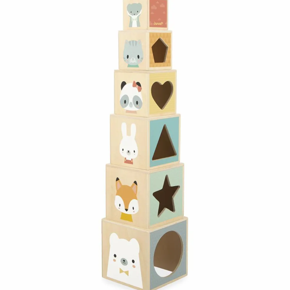 Les cubes à empiler Pure (6 pièces) de Janod offrent bien plus qu’un simple jeu de construction. À travers leurs formes, leurs couleurs tendres et leurs jolies illustrations, ils éveillent les sens et accompagnent le développement moteur des tout-petits dès 1 an.