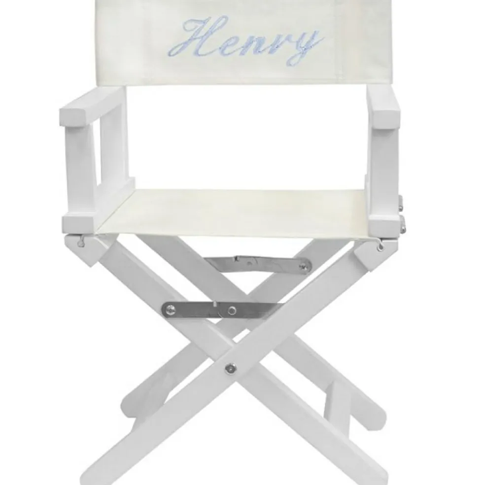 Le fauteuil metteur en scène bleu clair pieds blancs de la marque ANVIE est un cadeau adorable et unique. L’enfant se sentira comme un grand dans ce joli fauteuil personnalisé spécialement pour lui.