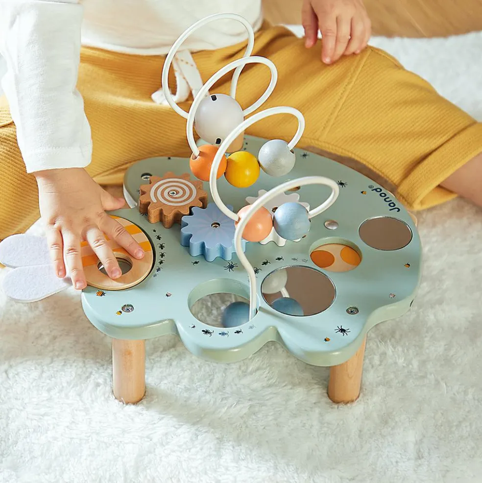 – Nombreuses activités : 1 table d’activités en forme de feuille, 4 engrenages amovibles, 1 looping, 1 roue des couleurs, 2 miroirs, 1 loupe en forme d’abeille.