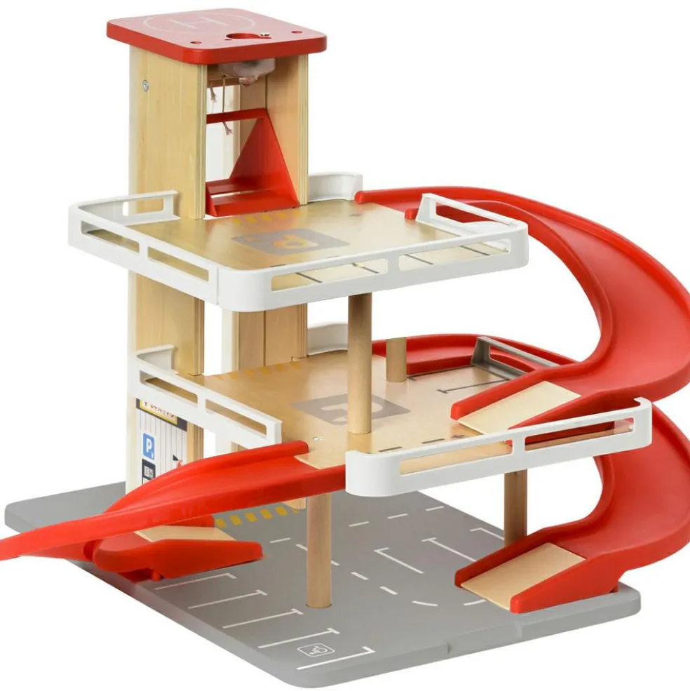 Ce garage lumineux de trois niveaux offre des possibilités d’histoires infinies à votre enfant ! A chaque étage, il trouve des places de parking pour garer ou faire circuler ses voitures. D’ailleurs, deux voitures en métal sont incluses pour qu’il commence à les faire rouler sans plus attendre. Pressé par le temps ou juste envie d’offrir des sensations fortes à ses voitures ? Il utilise le grand ascenseur mécanique qui passe par tous les niveaux. Le dos de l’ascenseur est transparent avec les numéros des étages, idéal pour savoir quand s’arrêter ! Envie de changement ? Au sommet de ce grand garage, un hélicoptère permet de quitter la terre pour s’aventurer dans le ciel. D’ailleurs, quand la nuit tombe, votre enfant peut éclairer son garage pour continuer à s’inventer de nombreuses histoires.