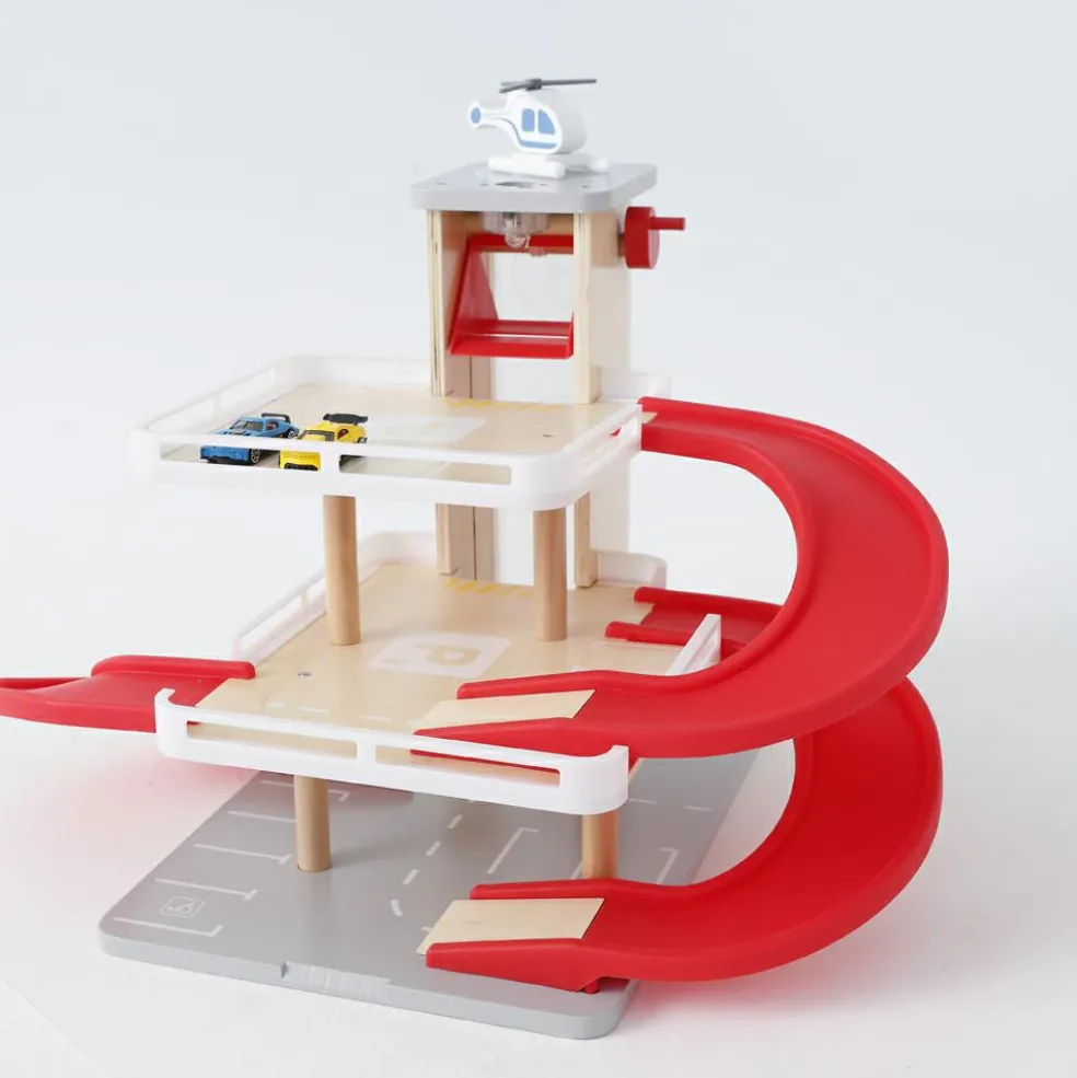 – Contient : 1 garage avec ascenseur manuel, 9 barrières, 3 rampes, 2 voitures en métal et 1 hélicoptère en bois.