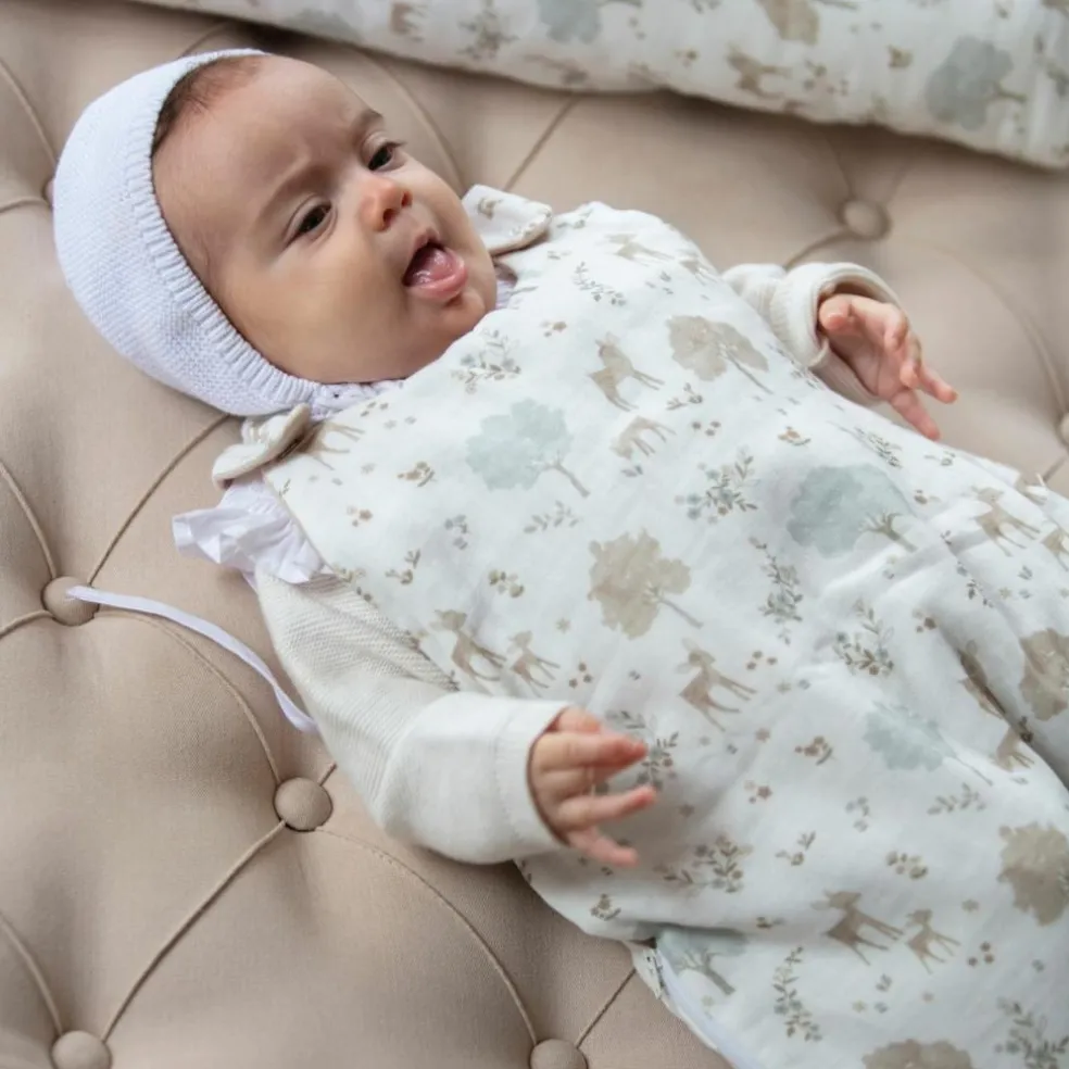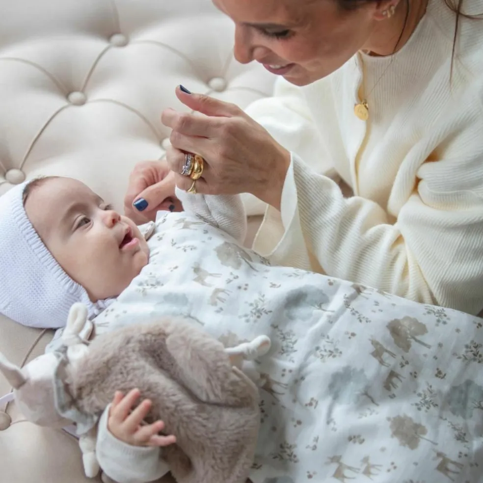– Confectionnée en mousseline imprimée de cerfs et d’arbres dans des tons neutres de coton 100%, extra douce et respirante, parfaite pour la peau délicate des nouveau-nés.