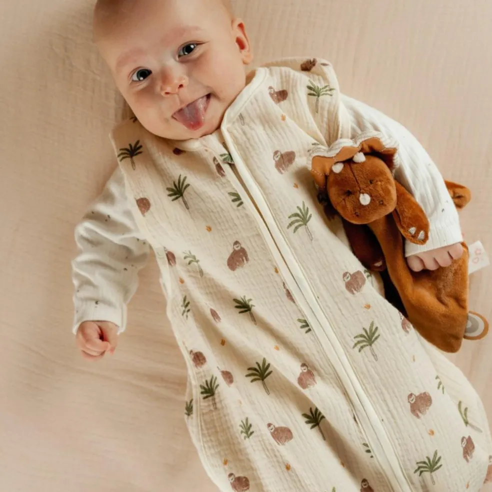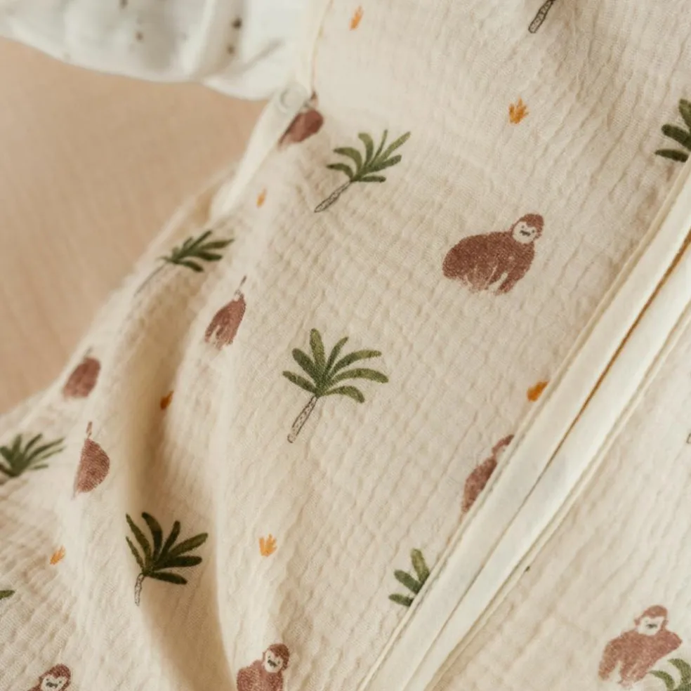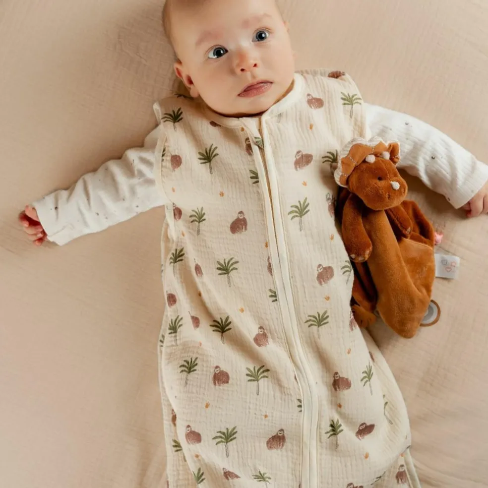 Conçue pour les bébés de 0 à 3 mois (50 cm), cette gigoteuse légère en mousseline 100 % coton est idéale pour les nuits d’été ou les chambres chauffées. Son tissu respirant garantit un confort optimal sans risque de surchauffe. Avec ses motifs délicats – paresseux malicieux, éléphants tendres ou petites fleurs douces – elle ajoute une touche poétique au rituel du coucher.
