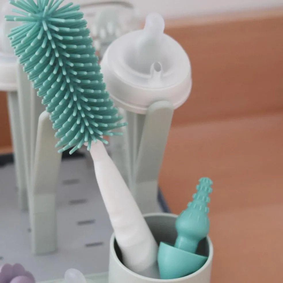 – Le goupillon est équipé d’un mini embout intégré, souple et texturé, idéal pour nettoyer les tétines et les petits accessoires.