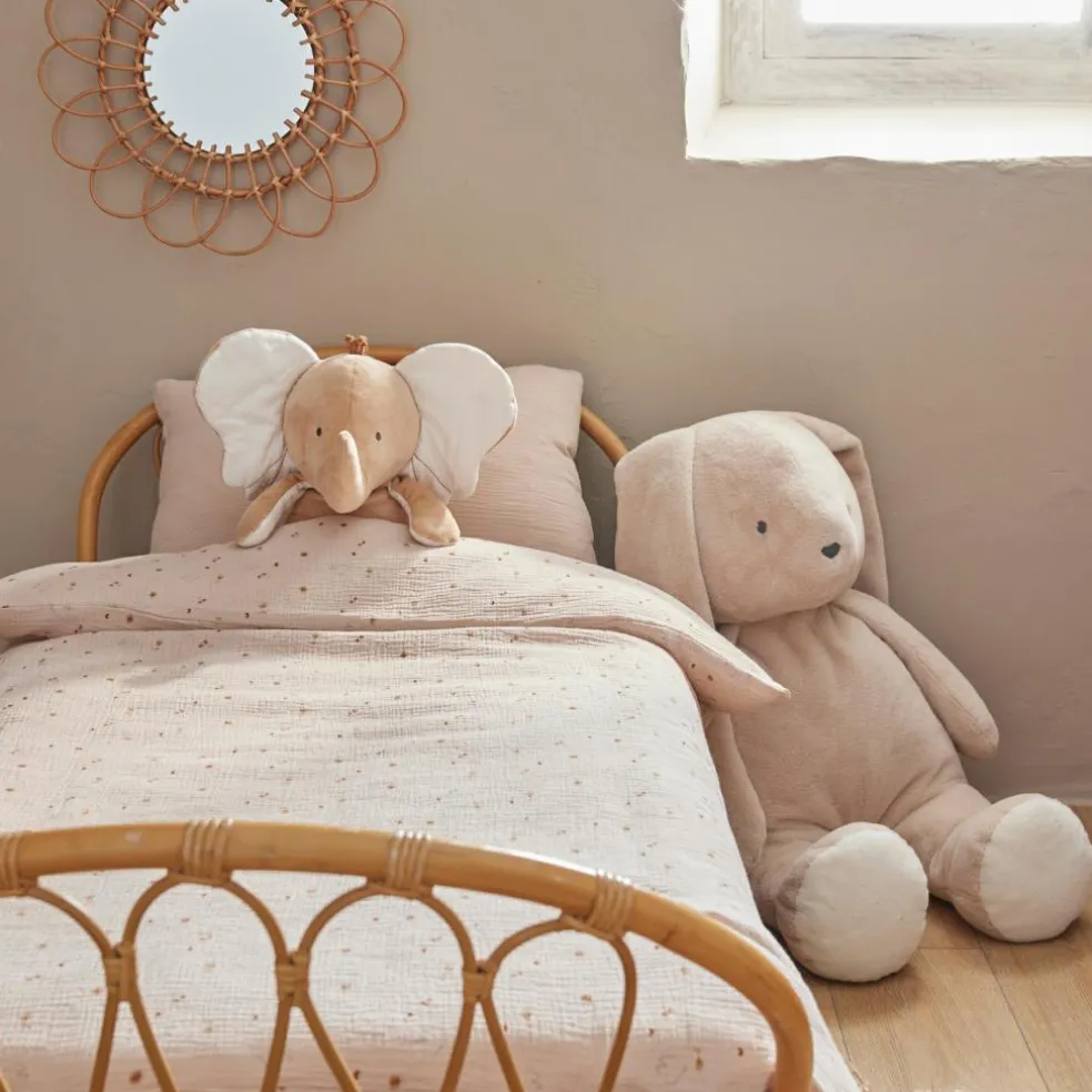 – Retrouvez la housse de couette en Veloudoux beige de la collection Bali, Moka & Snow avec sa girafe rebrodée, elle peut aussi être utilisée comme couverture et reste toujours bien en place sous le matelas.