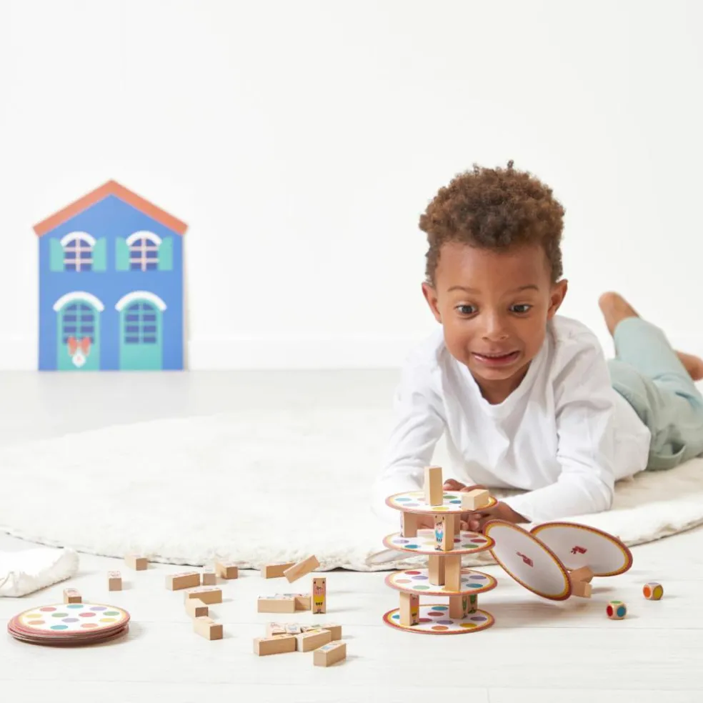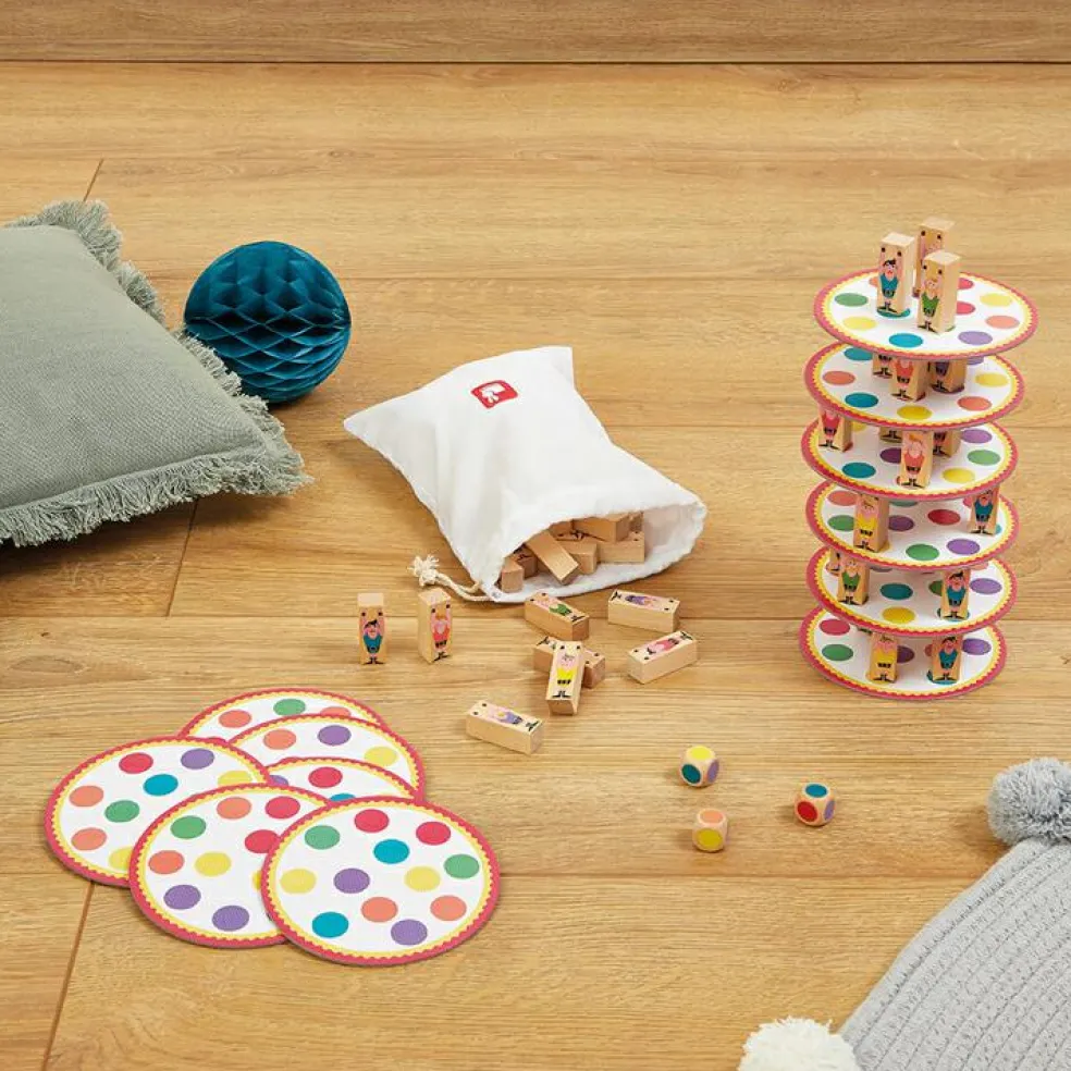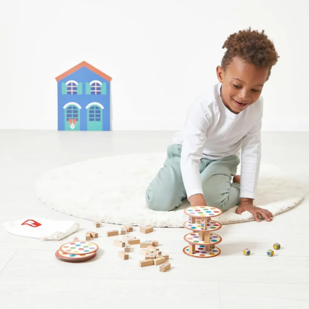 Lancez les dés puis placez vos acrobates de façon stratégique pour créer la tour la plus haute possible. Le premier à la faire tomber a perdu !