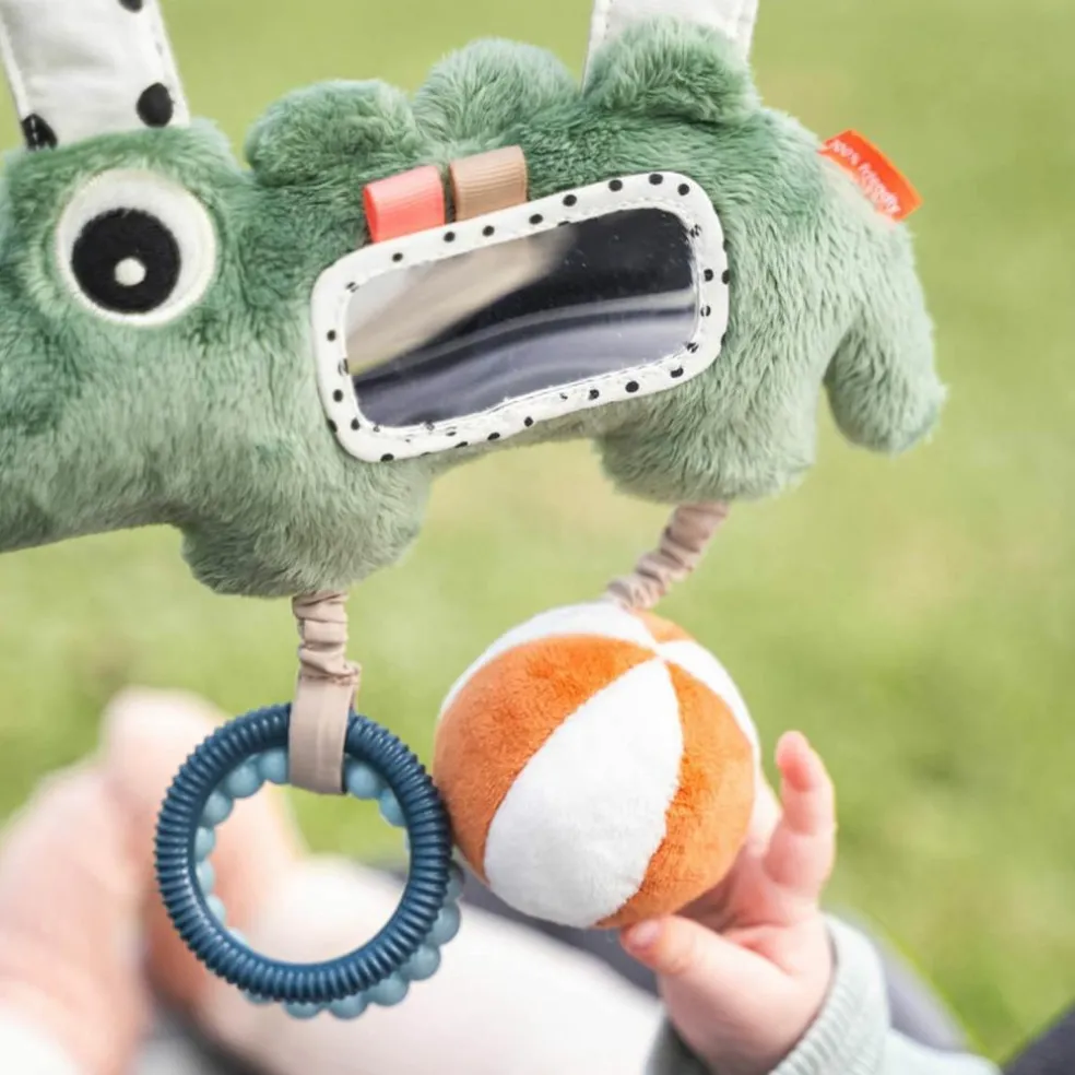 – Bébé découvrira des éléments sensoriels comme une clochette et différentes textures pour stimuler son ouïe et son sens du toucher.