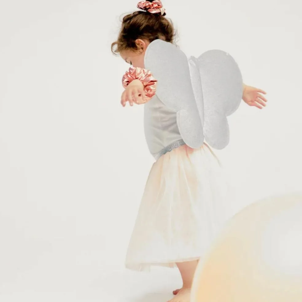 – Ailes de papillon pailletées argentées avec bretelles élastiques.