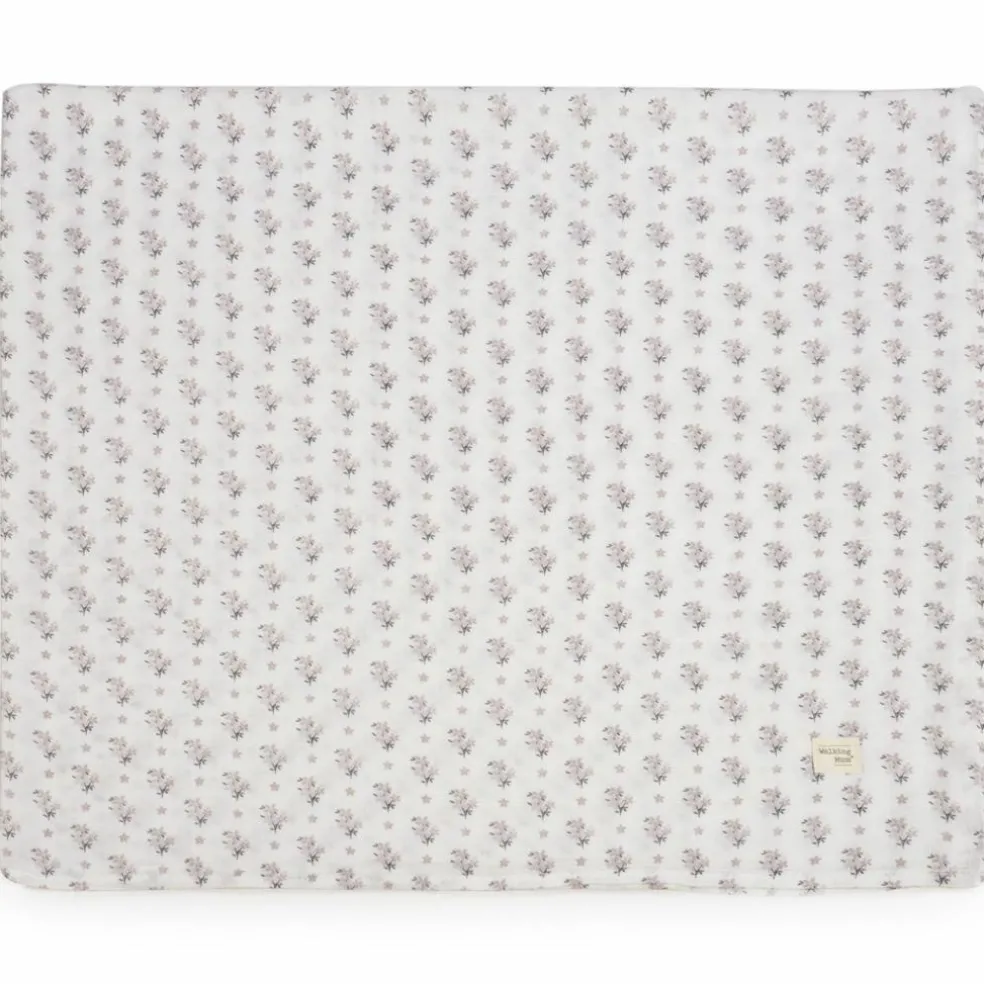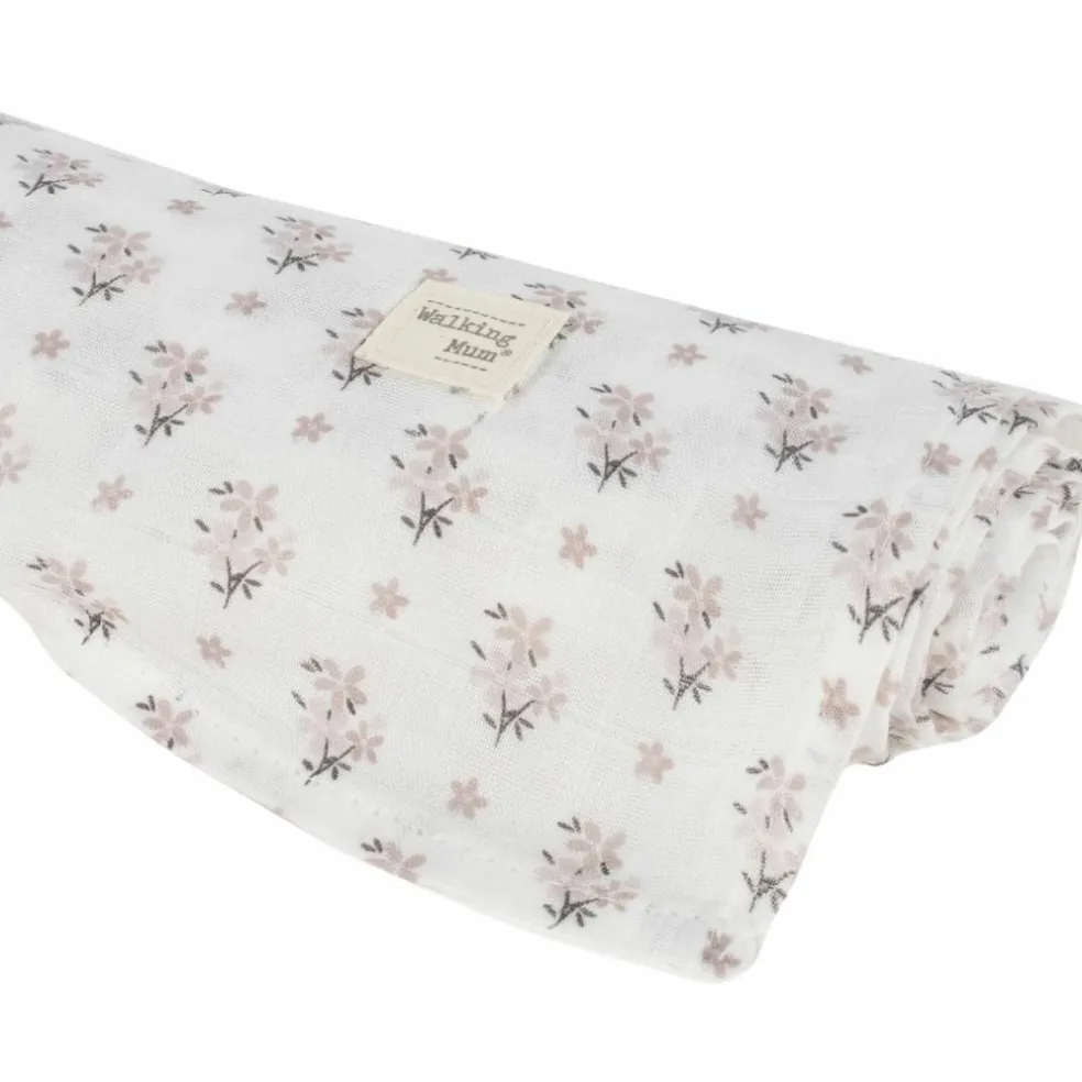 – Le lange Botton à imprimé floral de Walking Mum, dans des tons neutres, est l’accessoire indispensable pour les soins du bébé.
