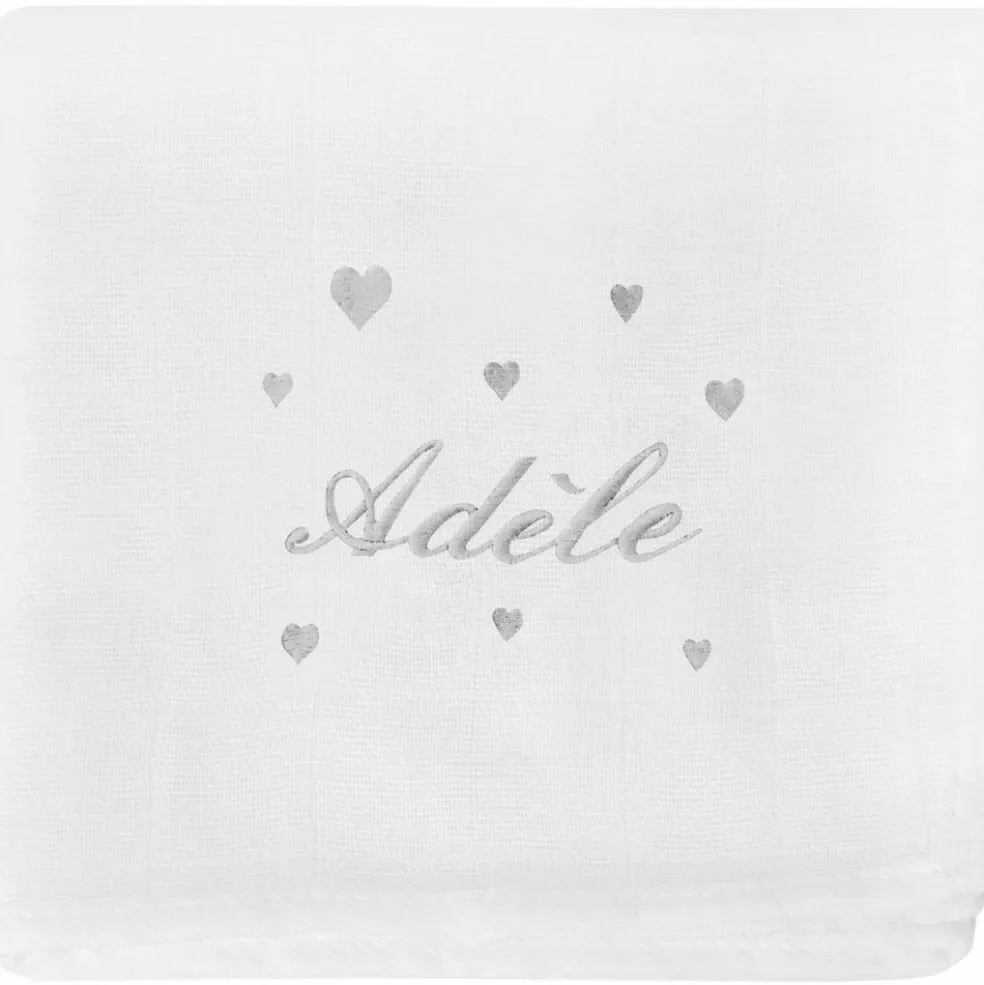– Traditionnelle couche blanche, 100% coton, brodée au prénom du bébé en gris avec des coeurs.