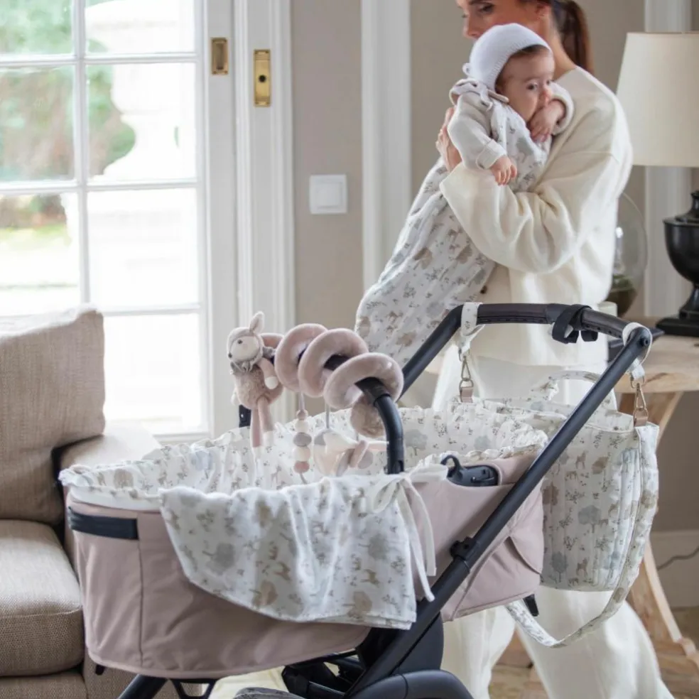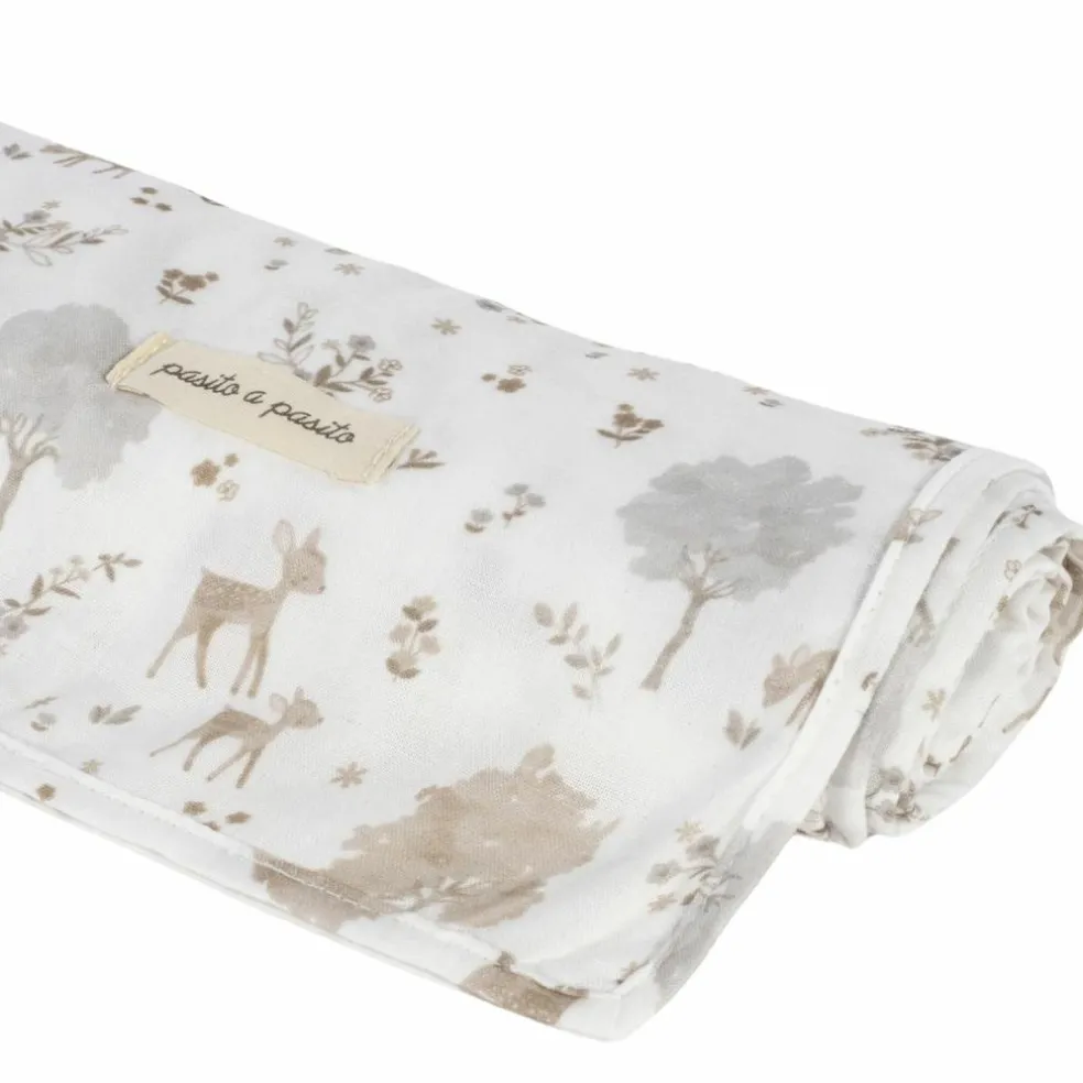 – Le lange Nara imprimé de cerfs et d’arbres dans des tons neutres par Pasito a Pasito est l’accessoire essentiel pour prendre soin de bébé.