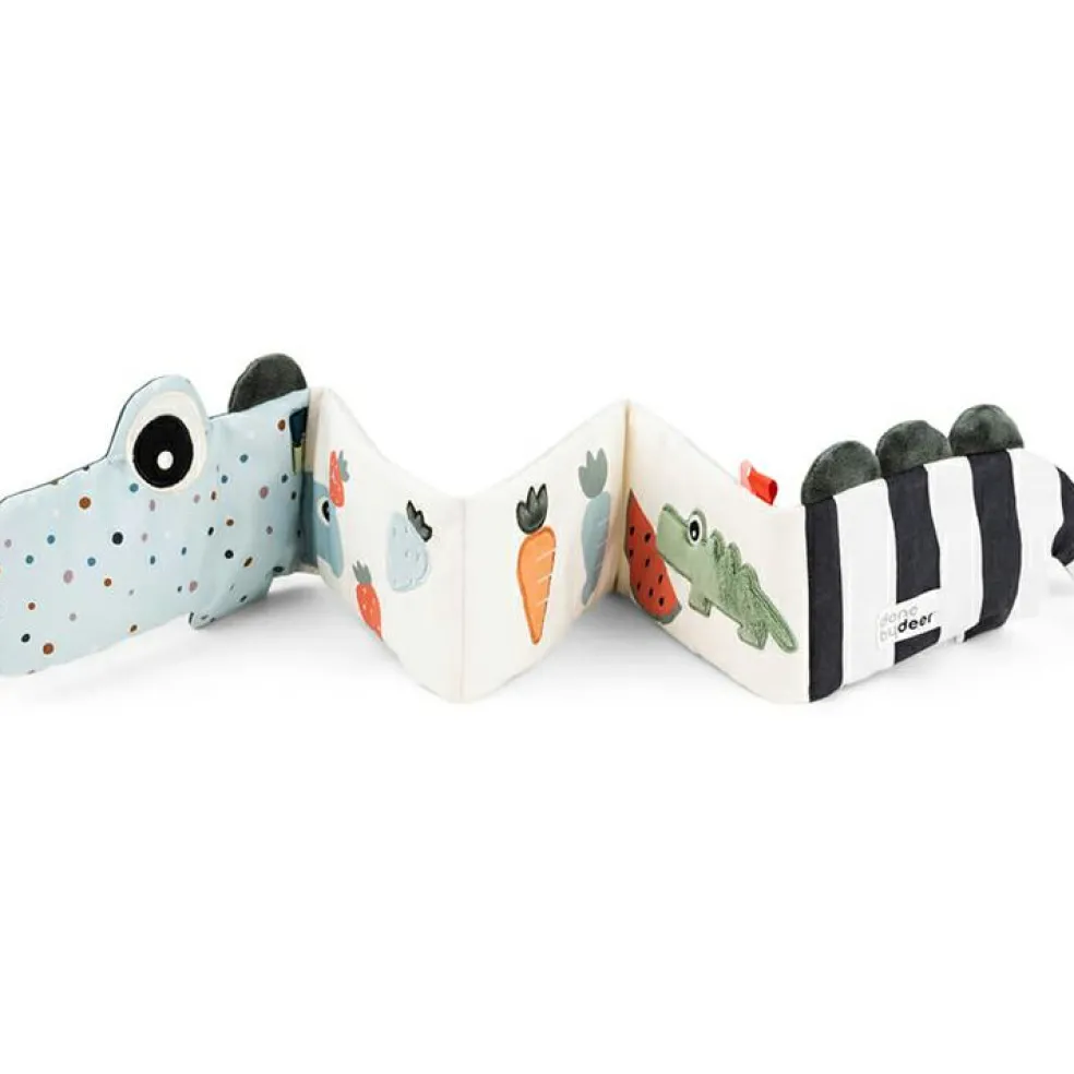 – Le crocodile vert est plein de surprises excitantes telles que des pois rigolos dans différentes couleurs et des rayures contrastantes en noir et blanc.