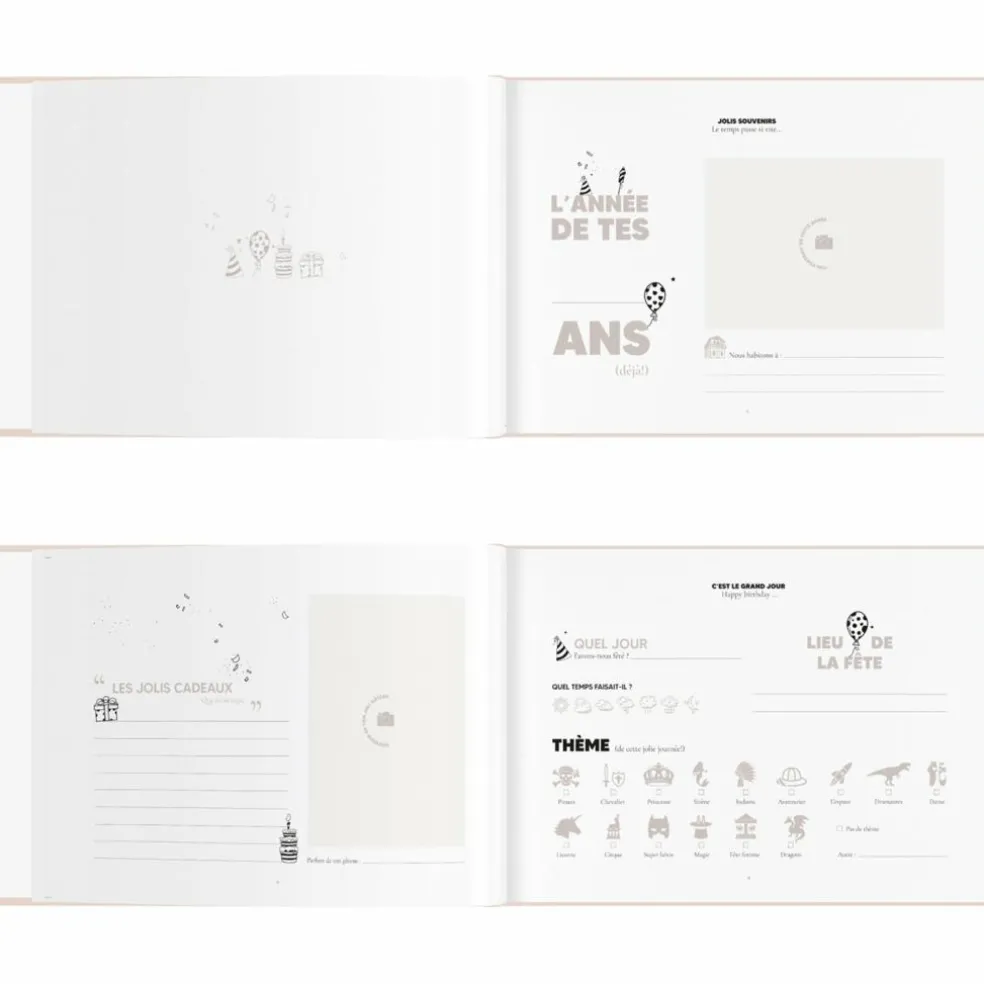 Un joli livre pour garder précieusement chaque souvenirs des anniversaires de votre enfant. Thème de la fête, les amis présents ce jour là, les activités effectuées ou encore la photo du joli gâteau, ce livre vous permettra de noter chaque détail afin de conserver précieusement tous ces jolis moments !
