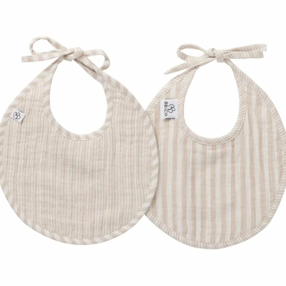 Lot de 2 bavoirs naissance en gaze de coton beige rayé galet