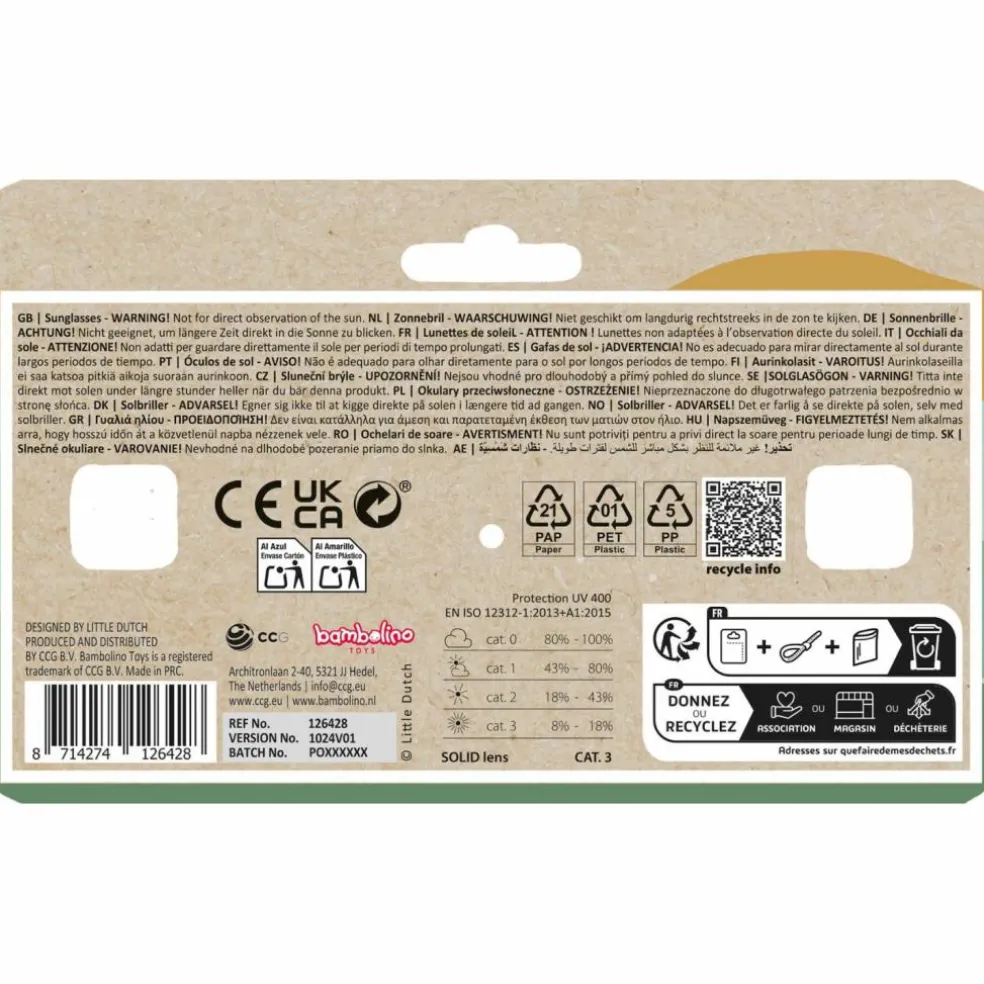 – Les lunettes sont dotées d’un filtre UV 400 (catégorie 3) qui protège les yeux de votre enfant du soleil.