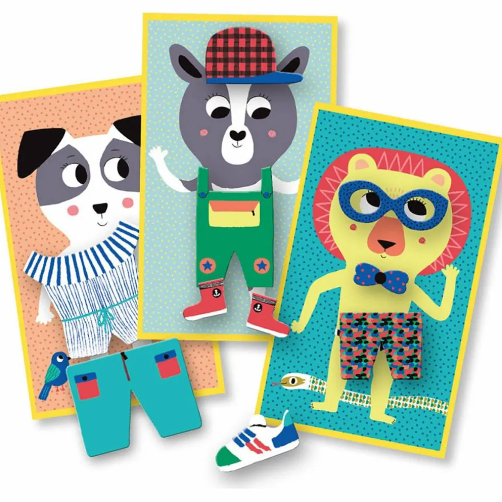 – Cette pochette contient 40 aimants de vêtements (et accessoires), ainsi que 10 cartes recto verso avec des silhouettes à habiller.