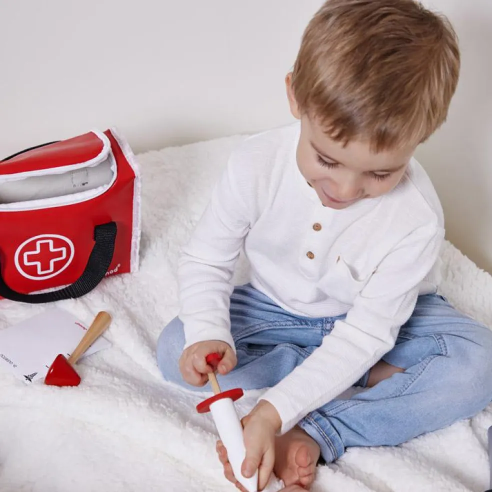 – 10 accessoires : seringue à ressort, marteau réflexe, bouteille de désinfectant, stéthoscope, otoscope avec loupe, thermomètre, languette, calepin d’ordonnance 30 pages avec crayon à papier, rouleau de bandage.
