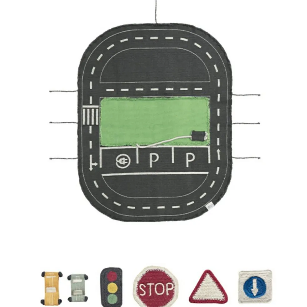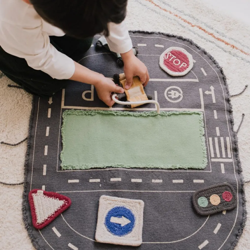 Chargez votre voiture et c’est parti ! Un jeu interactif en toile de base gris foncé avec une route, un carrefour et un parking imprimés. Livré avec des accessoires artisanaux : un feu tricolore, un panneau stop, un panneau cédez le passage, un panneau fléché, un chargeur de voiture et 2 voitures. Ce green toy est fabriqué à partir de textiles recyclés.