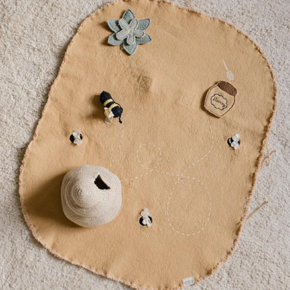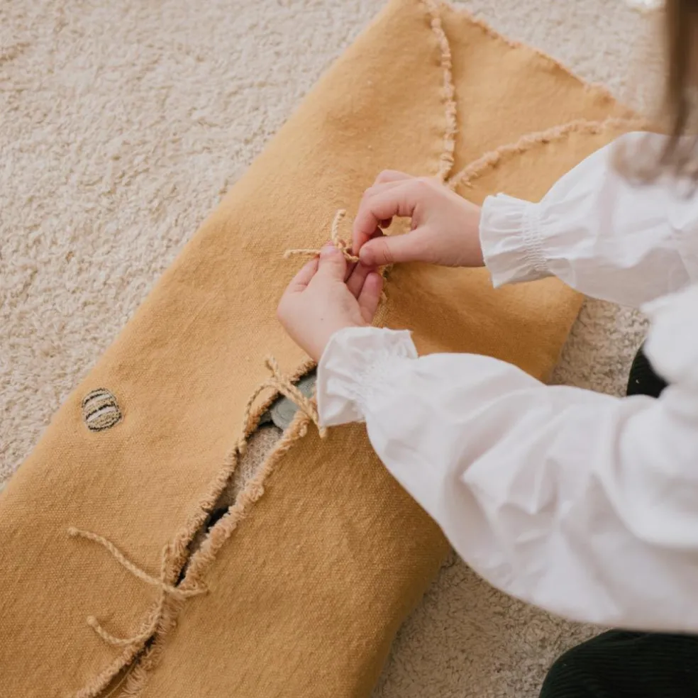 – Cette toile couleur miel est livrée avec 4 accessoires textiles fabriqués à la main pour jouer avec.