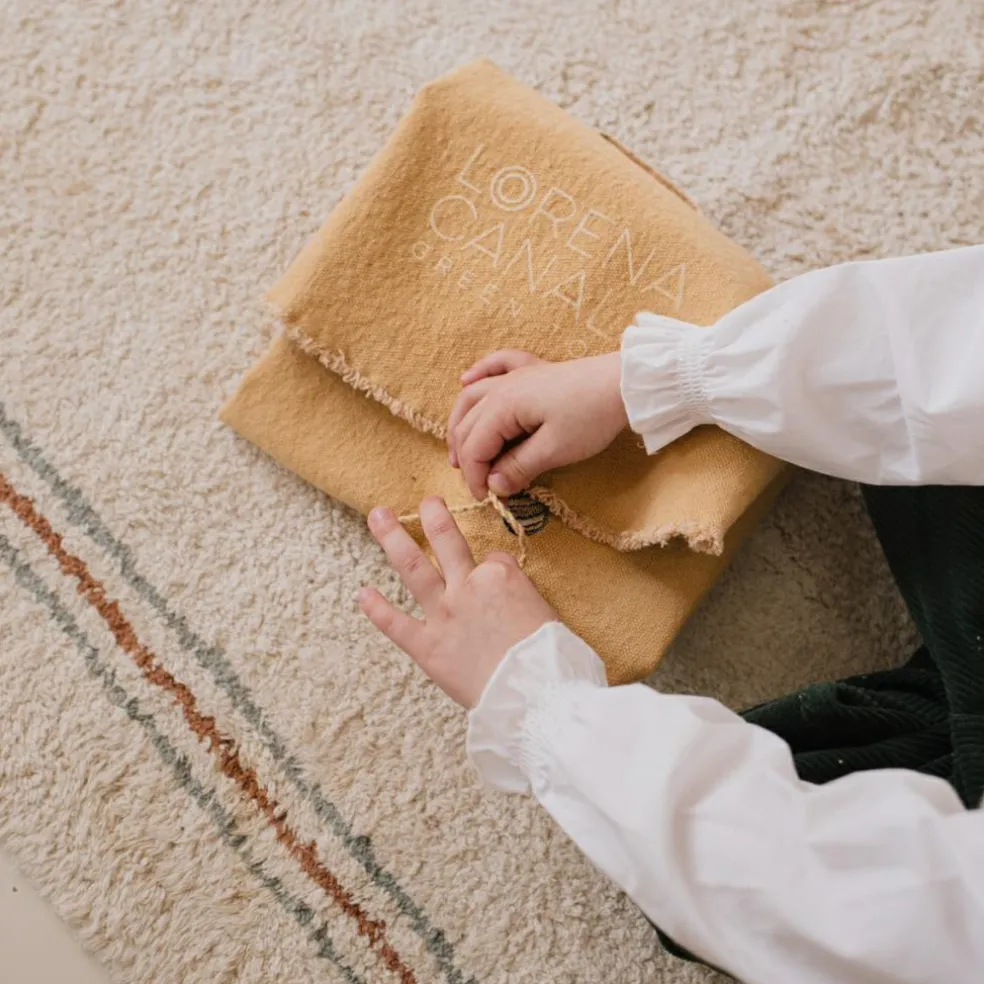 Une mallette textile qui stimule l’imagination et le jeu interactif. Cette toile de couleur miel est accompagnée de quatre accessoires textiles fabriqués à la main : une ruche de cordes en coton, une fleur en toile bleue, une abeille mignonne et un pot de miel. Elle comporte une piste imprimée que l’abeille peut suivre dans son voyage pour récolter du nectar et est décorée d’abeilles brodées avec des ailes en coton. Ce green toy est fabriqué à partir de textiles recyclés.