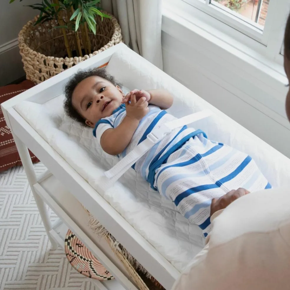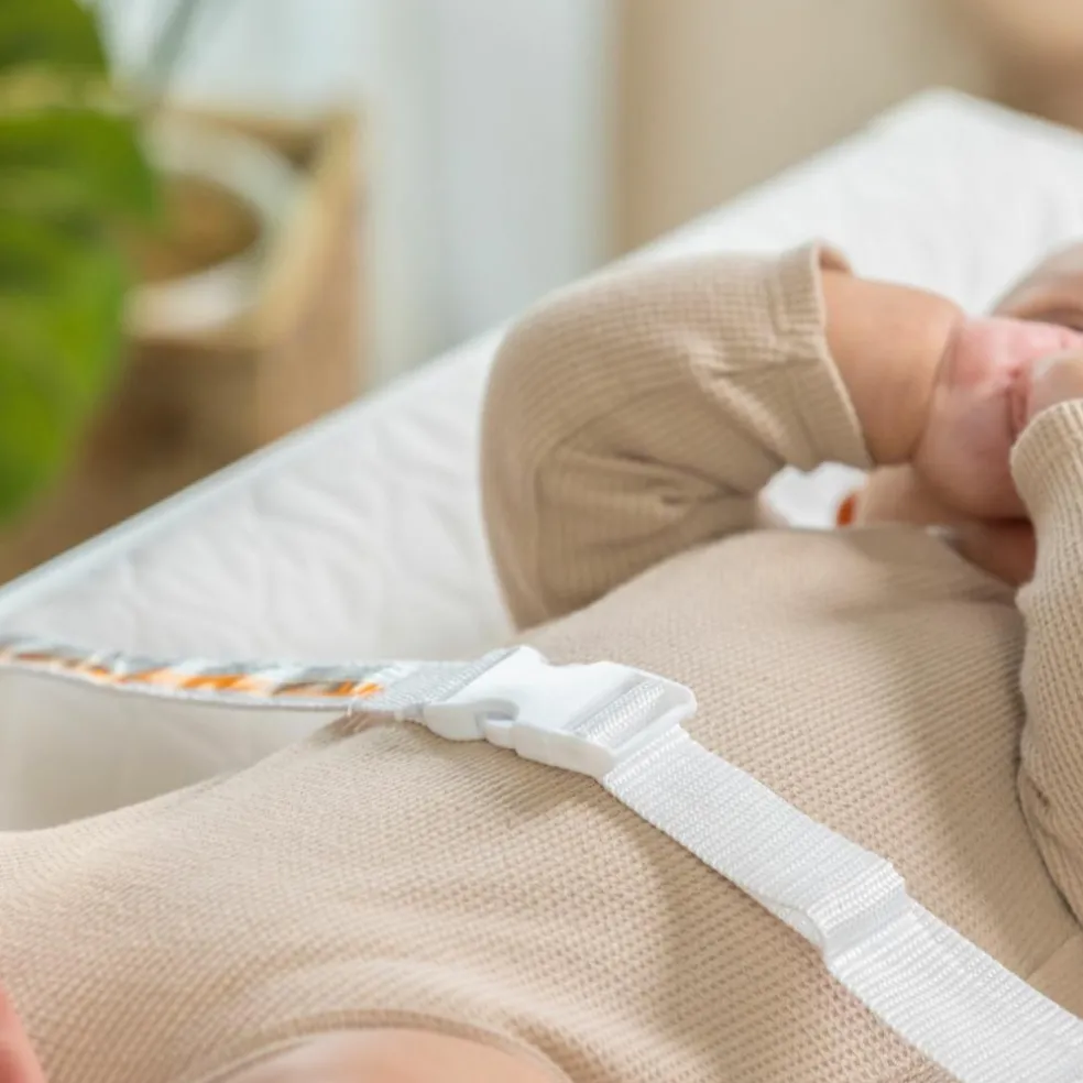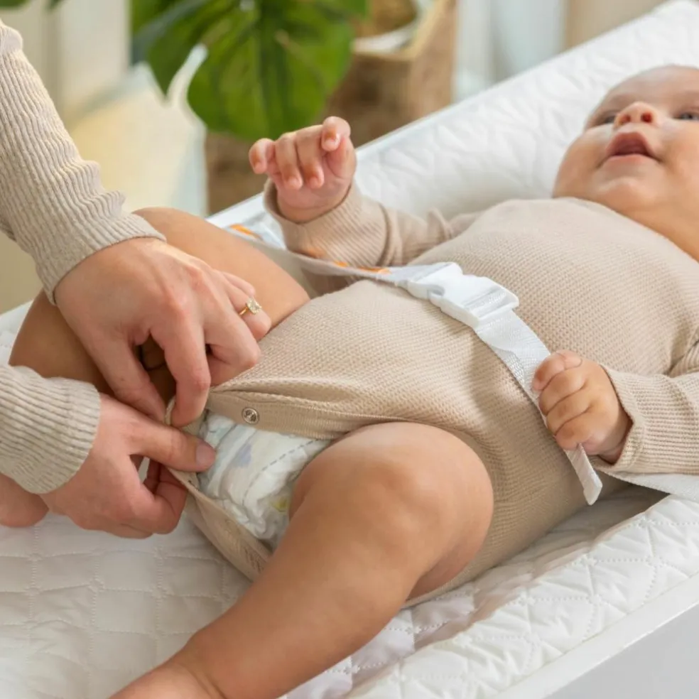 – Sécurité renforcée : Grâce à ses rebords incurvés et sa ceinture de sécurité ajustable, bébé reste bien en place, même lorsqu’il gigote. Une sangle supplémentaire située sous le matelas garantit une fixation solide à la table à langer.